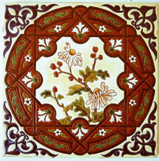 CREIL-MONTEREAU et BORDEAUX ? 3 carreaux. Oiseau et insecte survolant des fleurs, 208 x 208 mm ; branche de pommier et papillon sur fond jaune, 210 x 210 mm ; cloisonné à décor de fleurs dans un entourage bordeaux et quatre écoinçons bleus, 208 x 208 mm.