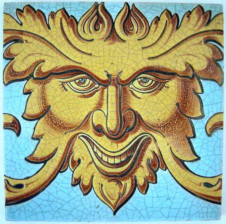 CREIL-MONTEREAU. 2 carreaux. Tête de faune marron sur fond bleu pâle, marque MONTEREAU B & Cie CREIL, vers 1880, 201 x 201 mm ; Bouquet de fleurs, vase et accolades (émaux), marque MONTEREAU CREIL, 200 x 200 mm.