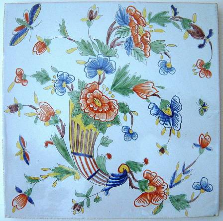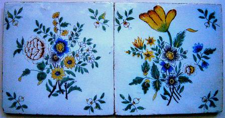 DESVRES. 4 carreaux. Bouquet de fleurs, marque Fourmaintraux-Courquin à Desvres Pas de Calais, 161 x 162 mm et 163 x 163 mm ; Décor polychrome rouennais à la corne, marque Fourmaintraux-Courquin fabricant à Desvres Pas de Calais, 200 x 200 mm ; Partie de fresque florale à dominante bleu, blanc et rouge, marque Fourmaintraux-Hornoy fabricant rue des Potiers à Desvres (Pas de Calais), 126 x 124 mm.
