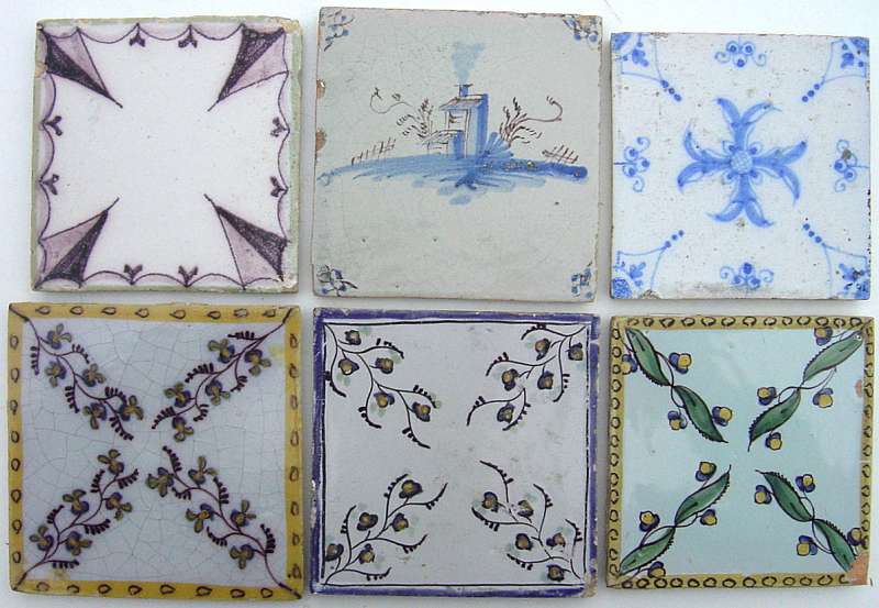 SAINT-OMER et LILLE. 10 carreaux, 130 x 130 mm. 2 carreaux polychromes à décor de fleurs et feuillages. XVIIIème, modèle similaire au musée Sandelin à St-Omer ; 2 carreaux polychromes à décor de fleurs ; 6 carreaux cobalt, manganèse et polychrome, modèles divers, XIXème.