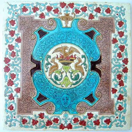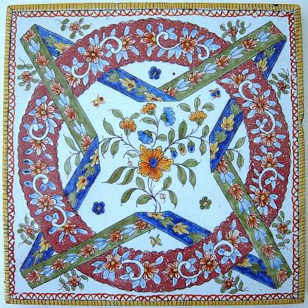 BORDEAUX et DESVRES. 2 carreaux. Phénix, masque et pampres, signe : 4 et IVOIRE, 202 x 202 mm ; Rubans et fleurs polychrome, marque FOURMAINTRAUX-HORNOY FABRIQUANT rue des Potiers à DESVRES (Pas de Calais), 198 x 198 mm.