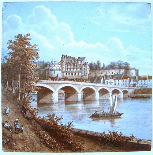 CREIL-MONTEREAU. 3 carreaux. Château de Chenonceaux, signé Dolléans, marque MONTEREAU B & C CREIL, 202 x 202 mm ; Le château de Fontainebleau, signé Dolléans, marque MONTEREAU CREIL, 202 x 202 mm ; Le château d'Amboise, marque MONTEREAU B & Cie CREIL, 201 x 201 mm.