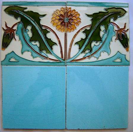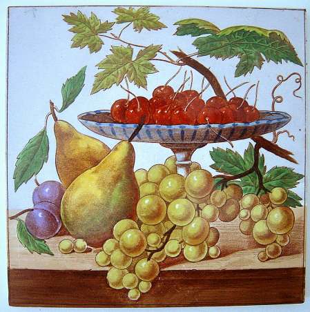 DESVRES, CREIL-MONTEREAU et DIVERS. 5 carreaux. Deux cygnes et nénuphars dans un cercle, marque C.F. Desvres, 203 x 203 mm ; Cygne nageant sous des iris jaunes, marque GFC FRANCE, 208 x 208 mm ; Coupe de cerises, raisin, poires, prunes et pampre, 203 x 204 mm ; 2 carreaux à décor de fleur de pissenlit ouverte, boutons et feuilles, 156 x 156 mm.