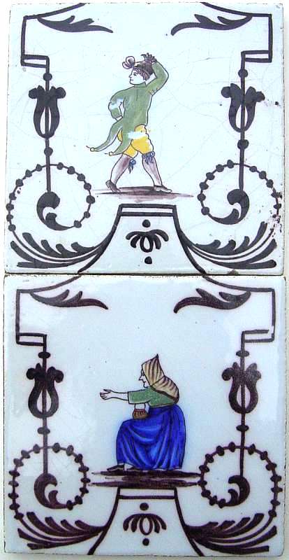 DESVRES. 3 carreaux. 2 carreaux polychromes à décor de personnages, fabrique Fourmaintraux, marque au petit coq, 130 x 130 mm ; Carreau polychrome à décor d'un vase Médicis au bouquet de fleurs, 130 x 130 mm.