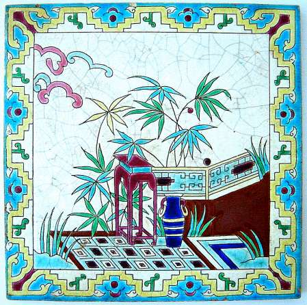 LONGWY et CHOISY LE ROI. 2 carreaux. Paysage Extrême-Orient polychrome, marque LONGWY FRANCE, 200 x 200 mm ; Pagode sur une île, oiseaux et bateau, marque BOULENGER & Cie FAIENCERIE DE CHOISY LE ROI SEINE, 210 x 210 mm.
