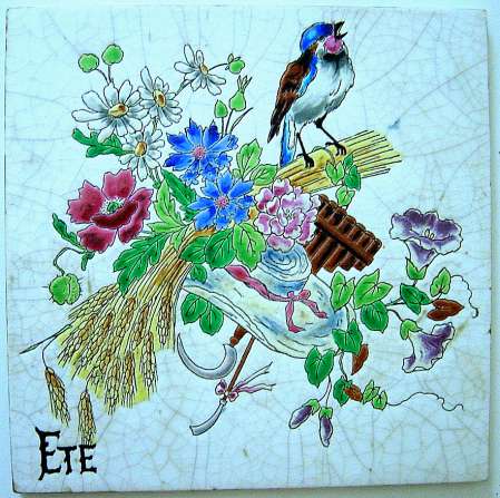 LONGWY. 4 carreaux. "Le printemps" : Trois oiseaux sur une barrière avec fleurs sur fond bleu, décor 3747, marque LONGWY FRANCE, 206 x 206 mm ; "L'été" : Oiseau posé sur un bouquet de fleurs et gerbe de blé, sur fond blanc, marque LONGWY, 202 x 202 mm ; "L'automne" : Oiseau tenant entre ses griffes un panier rempli de fruits et fleurs, sur fond turquoise, décor 3238, marque LONGWY, 202 x 202 mm ; "Lhiver" : sept oiseaux dissimulés sous des branchages enneigés, marque LONGWY, 202 x 202 mm.
