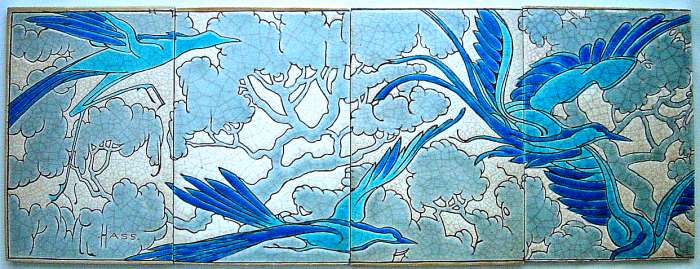 LONGWY. Suite de 4 carreaux, échassier bleu, signature marron HASS, marque LONGWY FRANCE, Env. 165 x 245 mm.