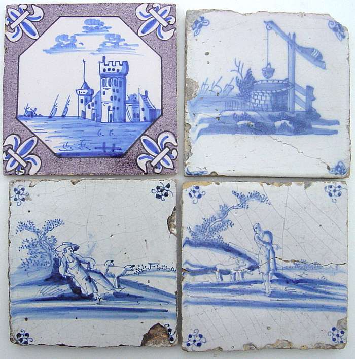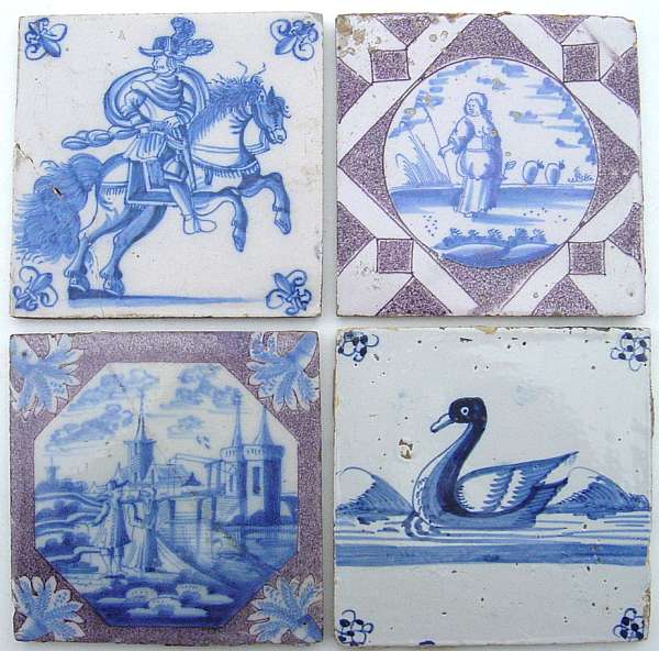 LILLE et HOLANDE, DELFT. 8 carreaux cobalt et manganèse à décor d'un puits, bergers, château, cavalier, bergère; couple et cygne, XVIIIème et XIXème. 130 x 130 mm.