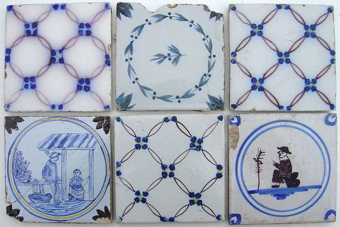 NORD. 10 carreaux manganèse et cobalt à décor de bateau, maison, moulin, personnages et fleurs, XIXème, 130 x 130 mm.