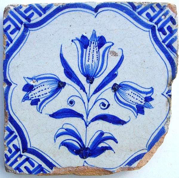HOLLANDE. DELFT. 2 carreaux. Carreau cobalt à décor d'une girafe et écoinçons Wang-li, XIXème, 130 x 130 mm ; Carreau cobalt à décor de tulipes et écoinçons Wang-li, XVIIIème, 130 x 130 mm.