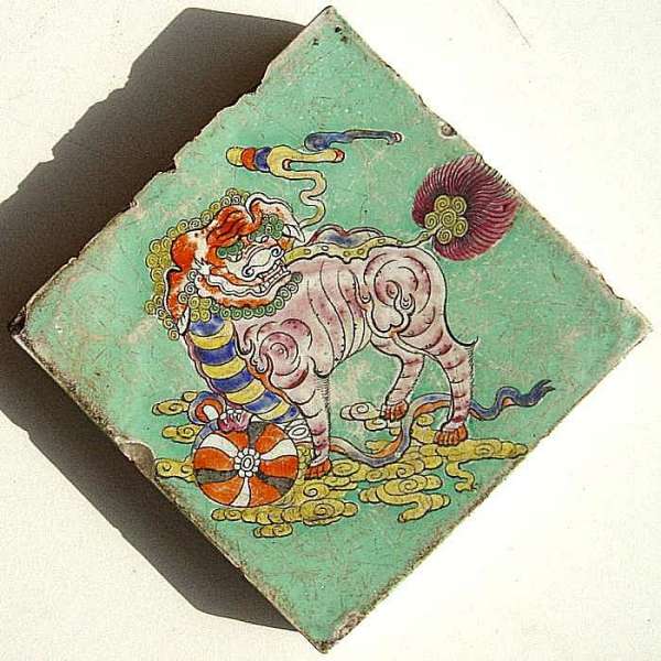 ESPAGNE, PORTUGAL et CHINE. 5 carreaux. Échassier, polychrome, XVIIIème, 134 x 134 mm ; Carreau polychrome à décor de fleurs, 141 x 141 mm ; Croix centrale, palmettes et entrelacs, polychrome, marque GRAN MEDAILLE ORO PARIS 78, 258 x 258 mm ; Animal fantastique, 124 x 125 mm ; Carreau à décor du chien Fo, polychrome, porcelaine, peint à la main, 140 x 140 mm.