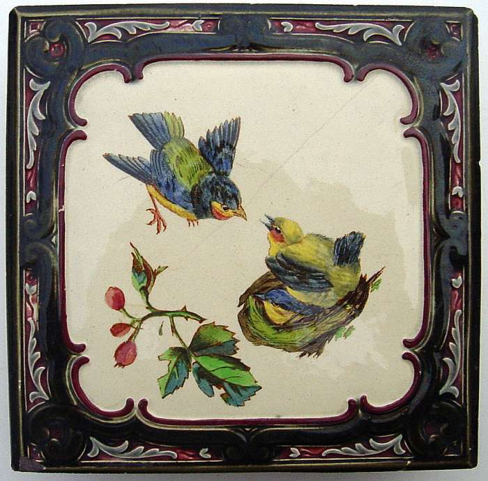 SARREGUEMINES. Carreau polychrome à décor d'oiseaux et d'églantines, 200 x 200 x 55 mm. (fêle) Joint carreau à décor de branches, feuilles de chêne et glands dans un cadre bleu, rosace orange au centre, 200 x 201 mm.