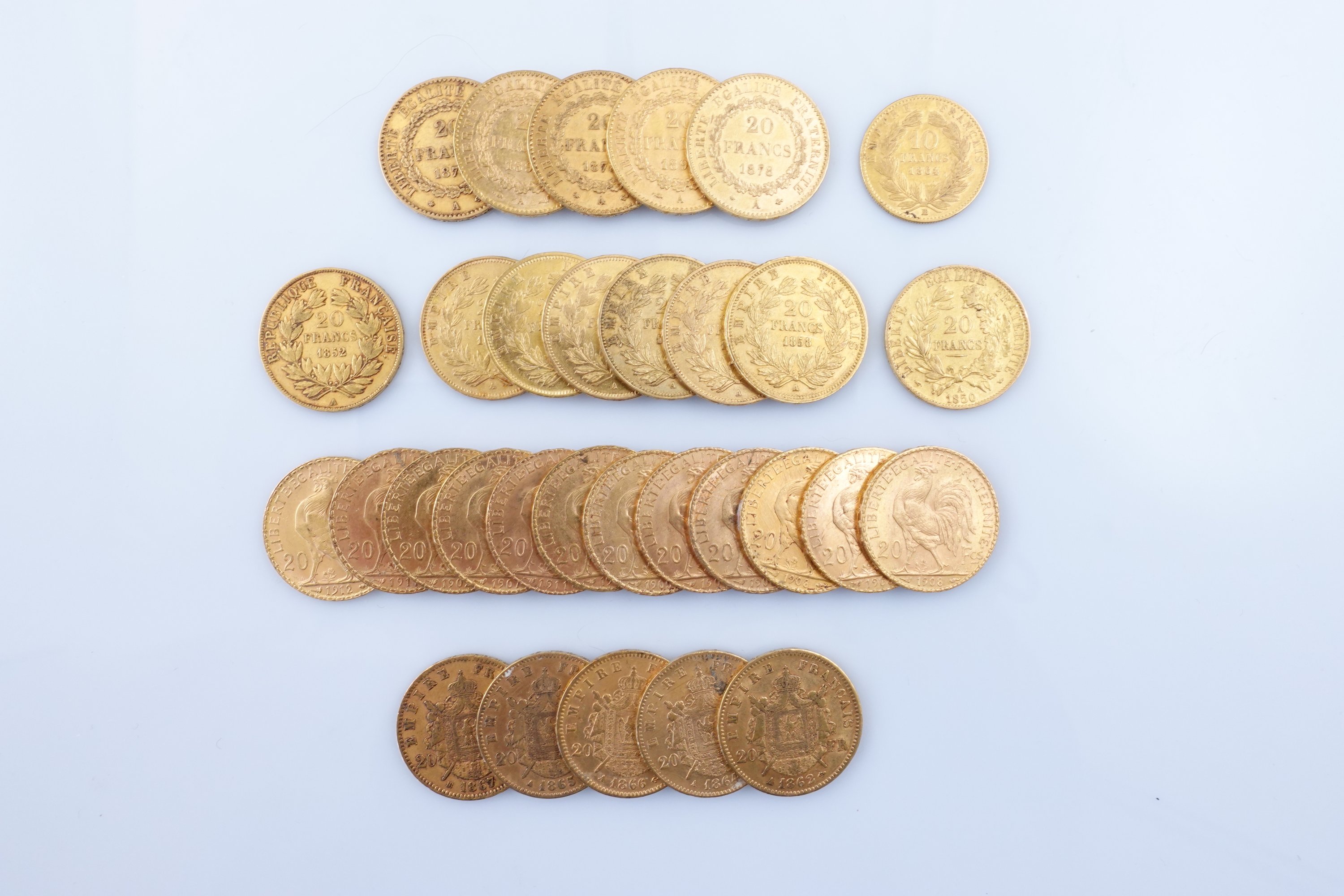 - 12 x 20 francs, Coq, 1902 (1), 1905 (2), 1906 (1), 1907 (1), 1908 (3), 1909 (1), 1911 (2), 1912 (1) ;