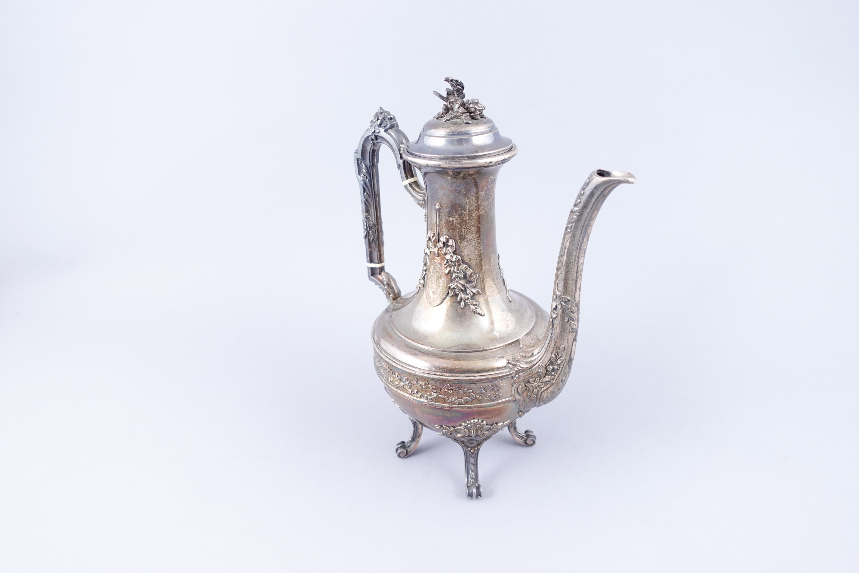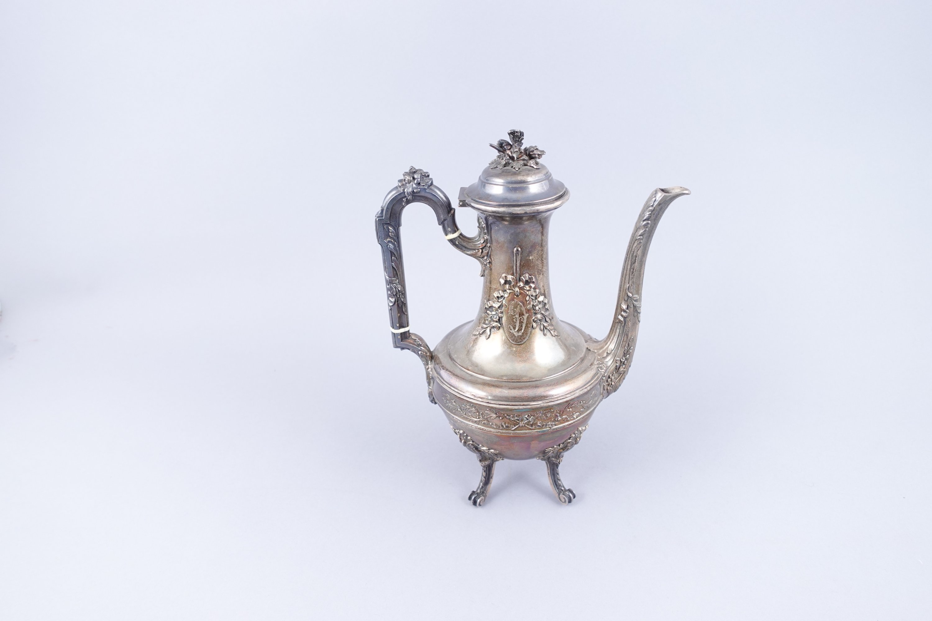 - Théïère quadripode de style Louis XVI, à décor de guirlande, fleurs et feuillages, mongrammée "D". Poinçon Minerve Ier titre. Haut. 27,5 cm. Poids brut : 685 g.