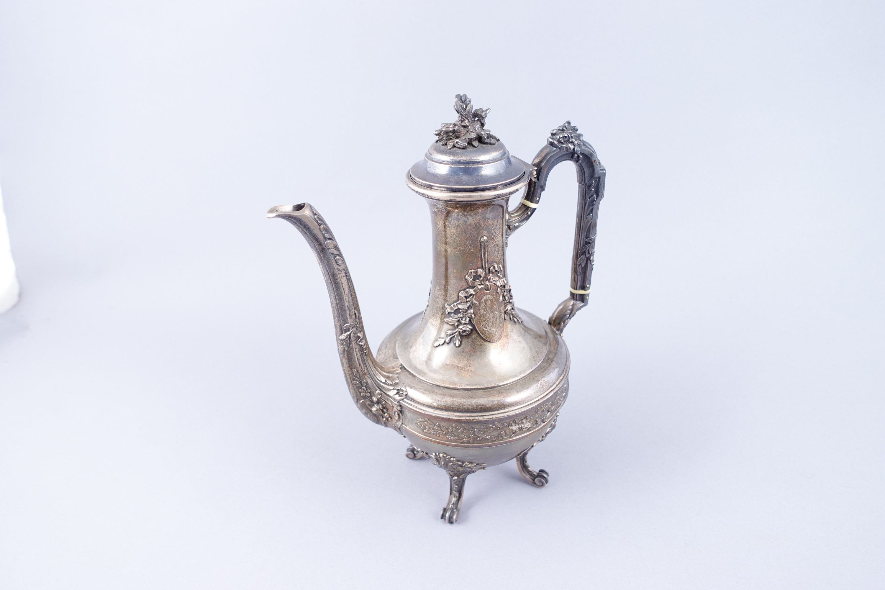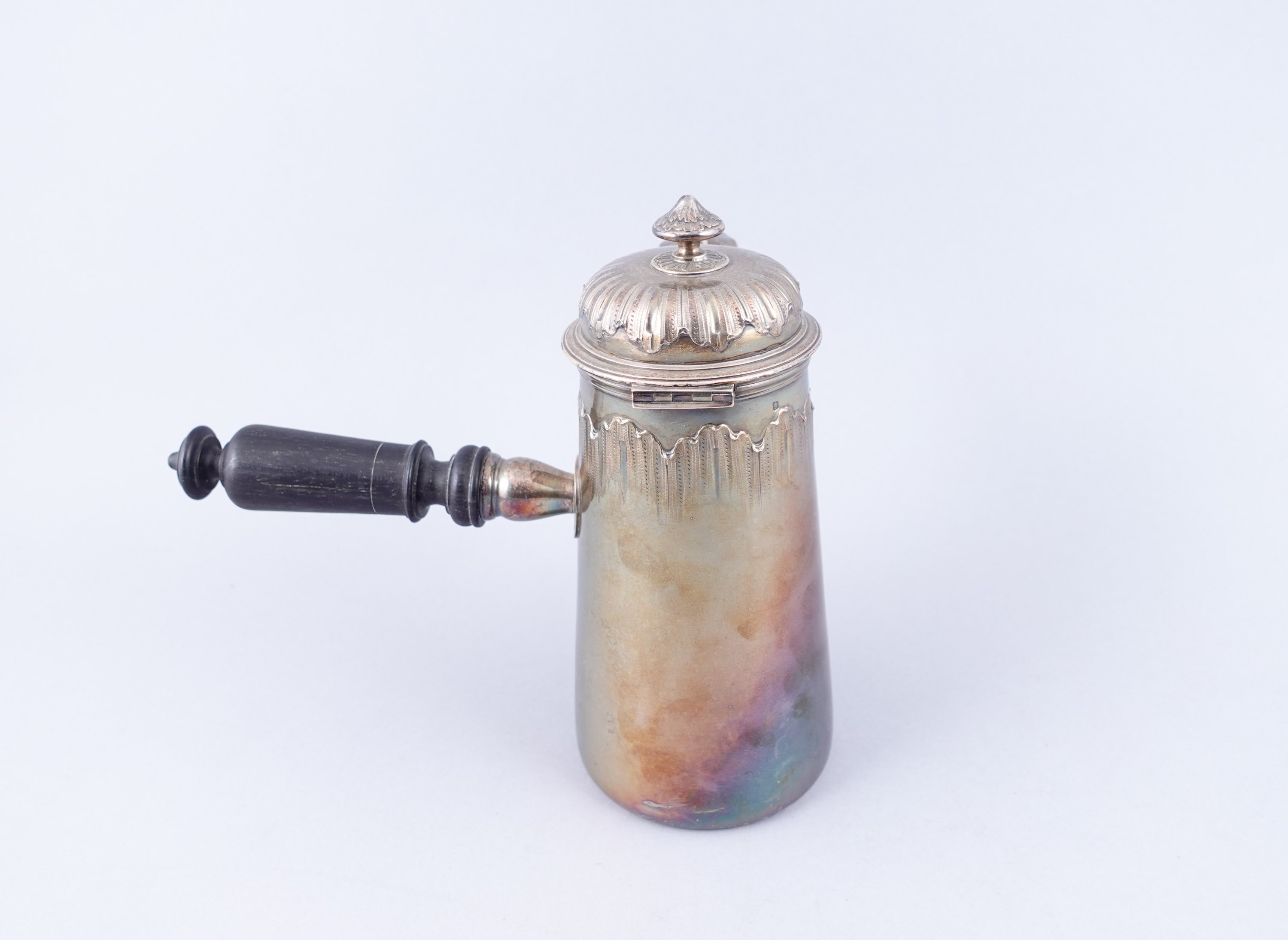 - Cafetière droite de style Régence, au bec verseur feuillagé, prise sur le couvercle et manche en bois noirci. Poinçon Minerve Ier titre. Haut. 20 cm. Poids brut : 602 g.