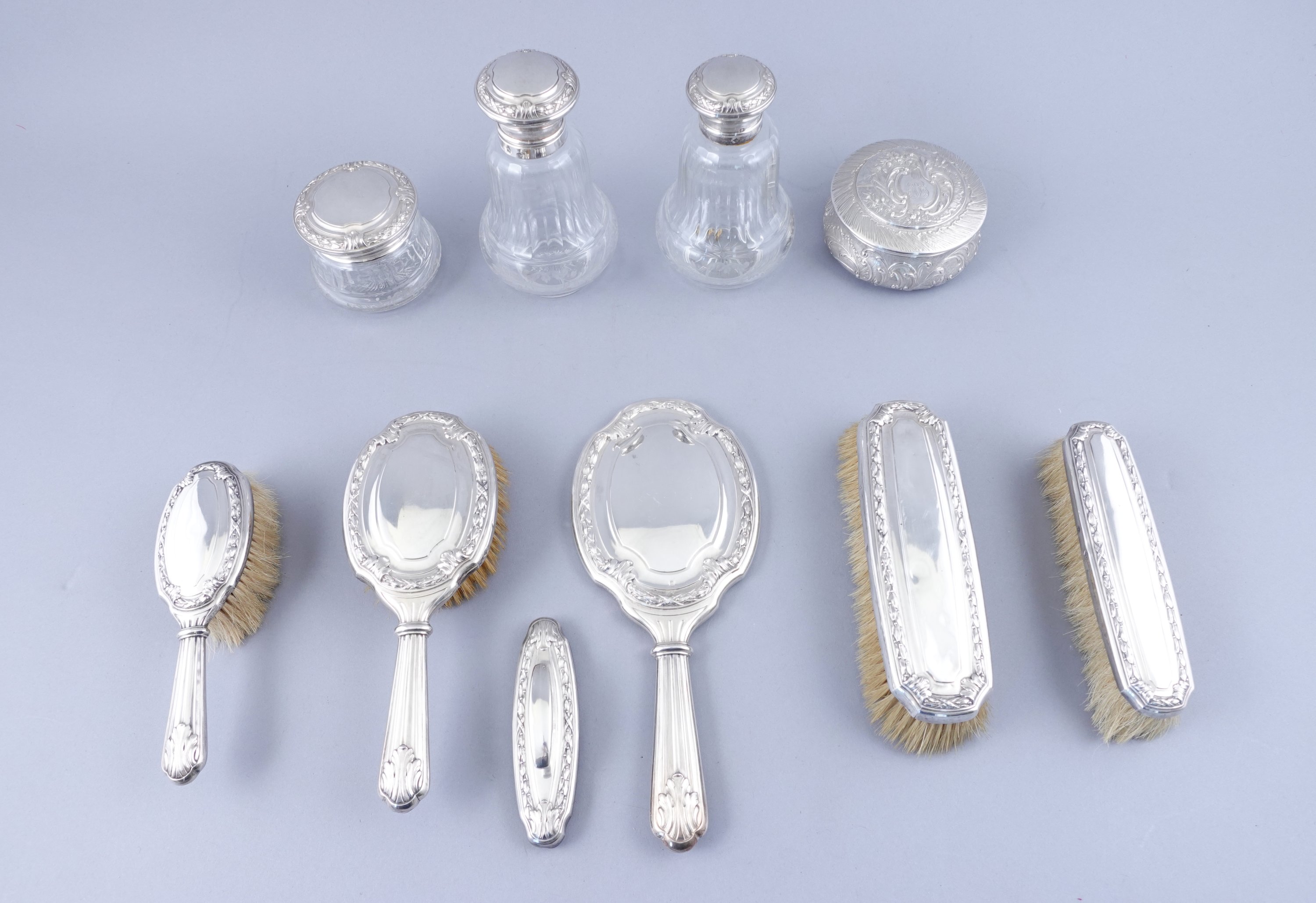 en argent à décor de tores de laurier comprenant : quatre brosses, un miroir, deux flacons, un poudrier et un tampon à ongles.