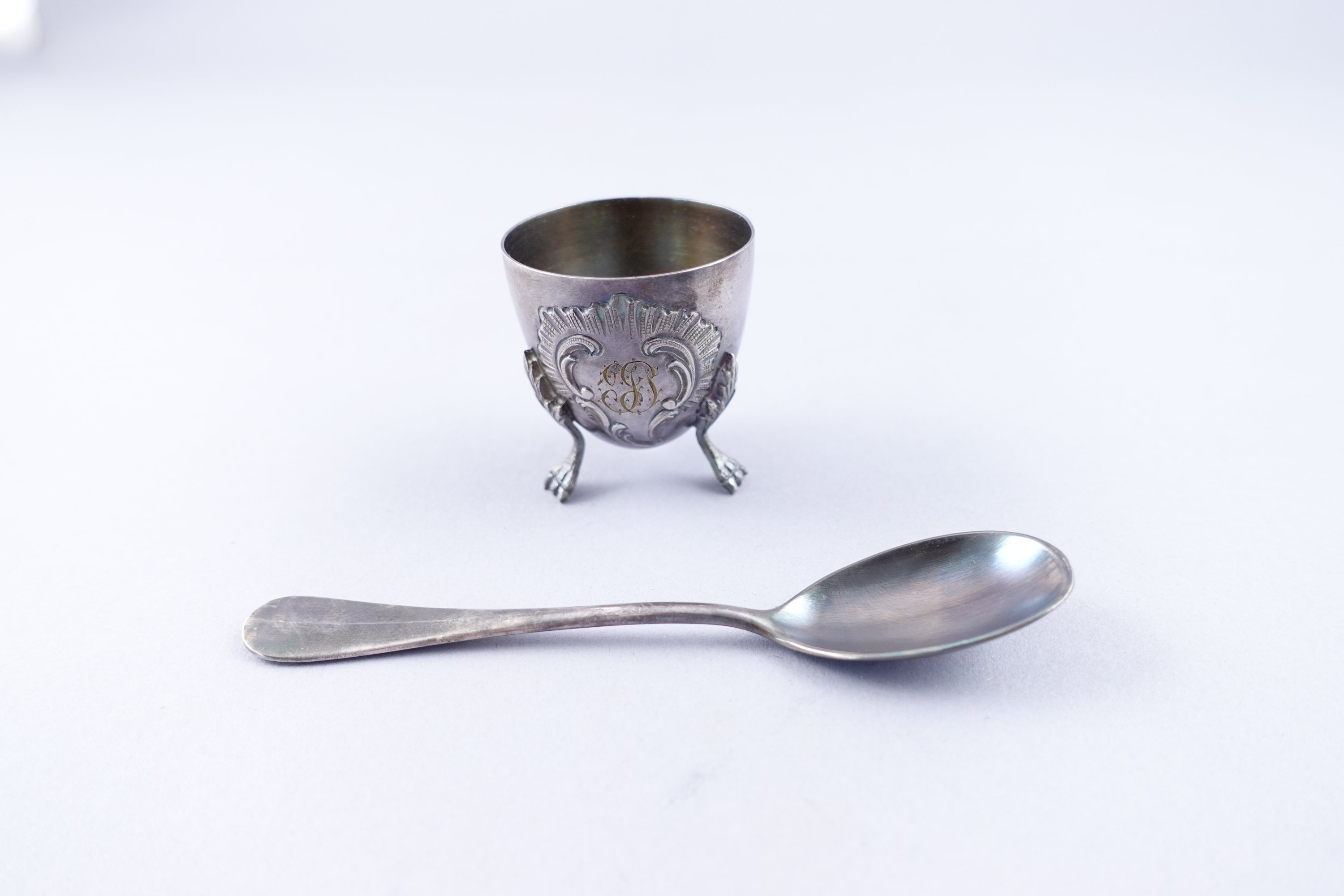 - Un coquetier en métal argenté à décor d'un cartouche monogrammé "FP", piétement tripode à griffes.