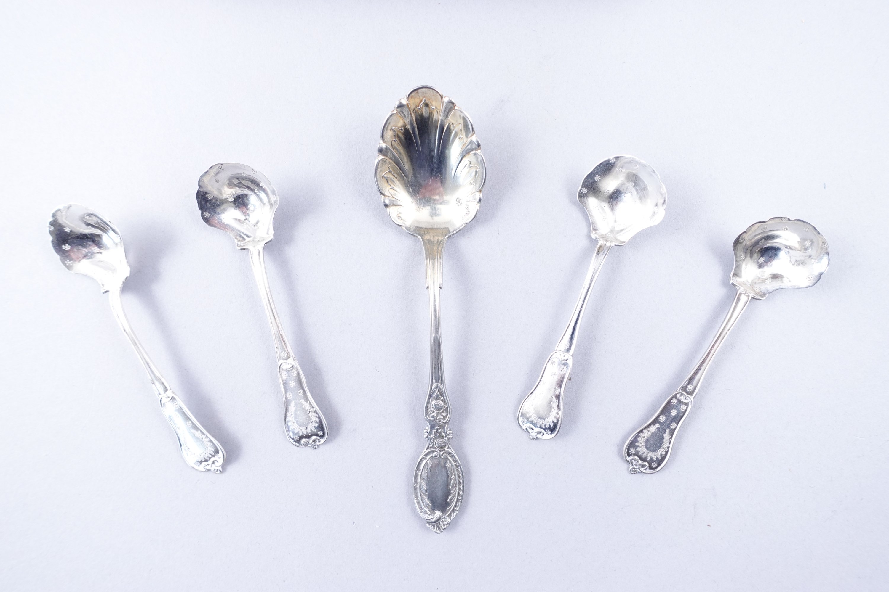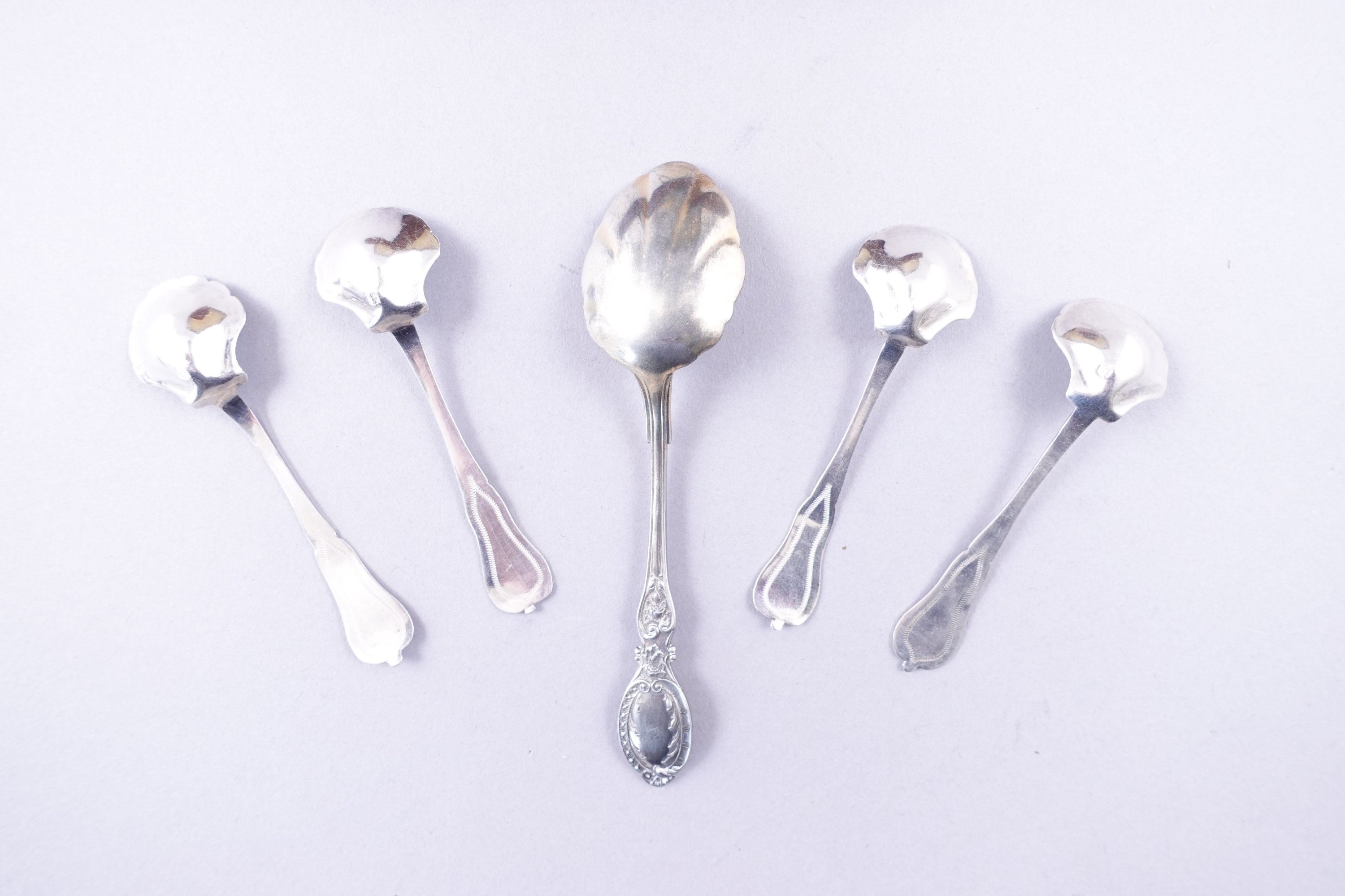 - Quatre cuillers à sel en argent à noeuds gordiens et une petite cuiller en métal argenté. Poids : 21,7 g.