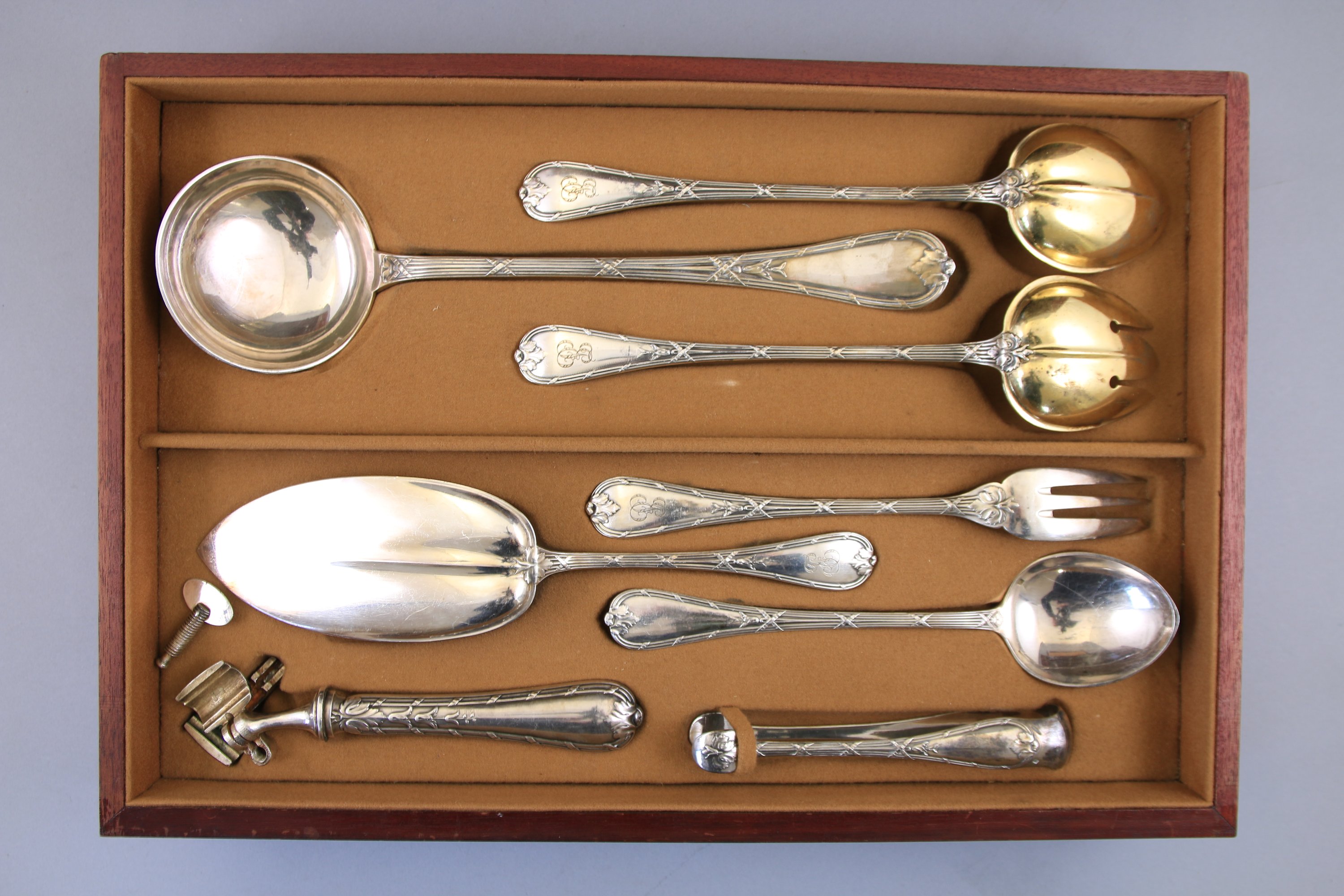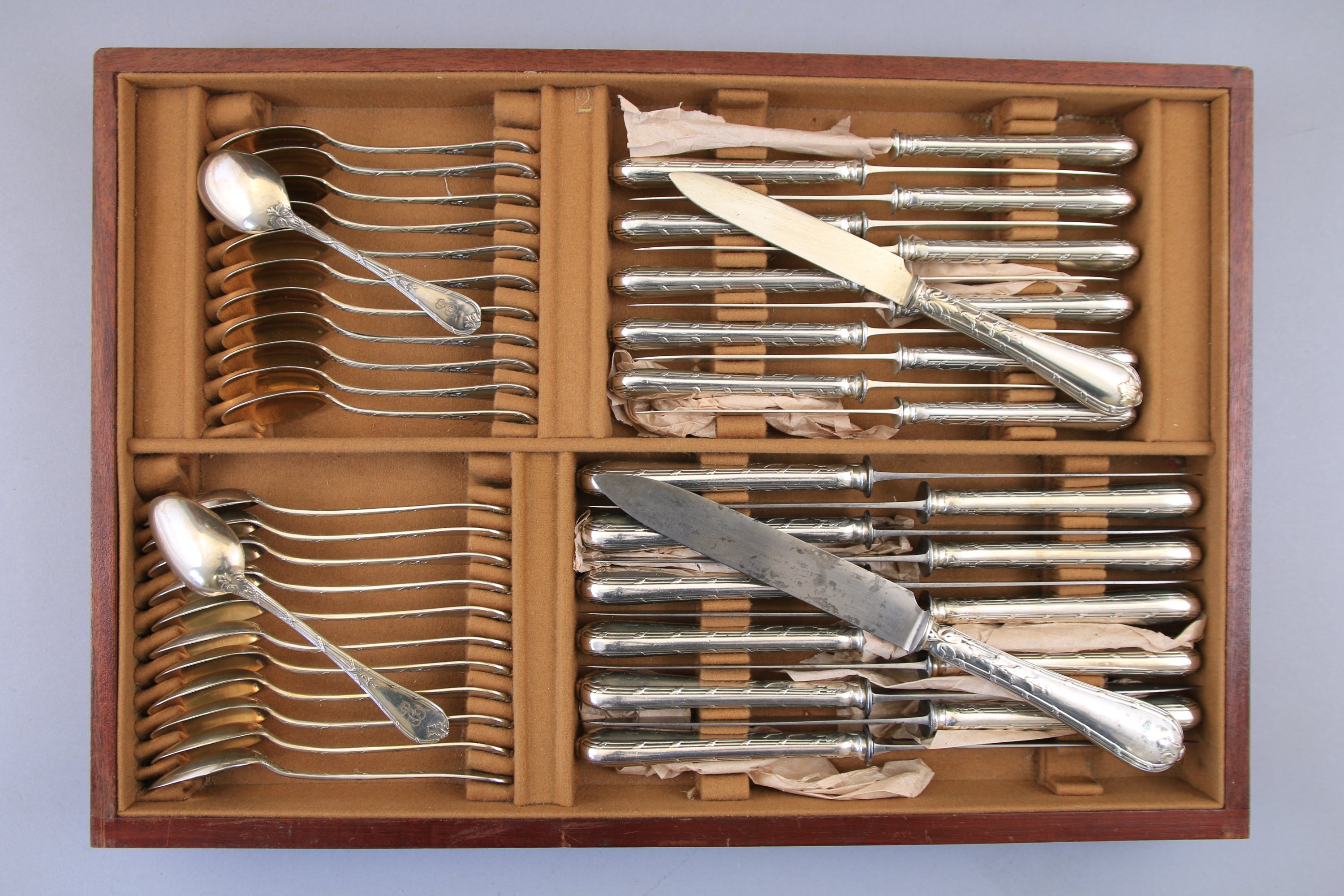 en métal argenté modèle rubans, elle comprend 12 couverts de table, 12 couteaux de table, 12 couverts à entremets, 12 couteaux à entremets, 12 cuillers à café, 12 cuillers à glace, 12 couverts à poisson, un service à découper, une cuiller à sauce, un couvert à servir le poisson, un couvert à salade, une louche, une pelle à tarte, un couvert de service, une pince à sucre et une pince à gigot. (cassée)