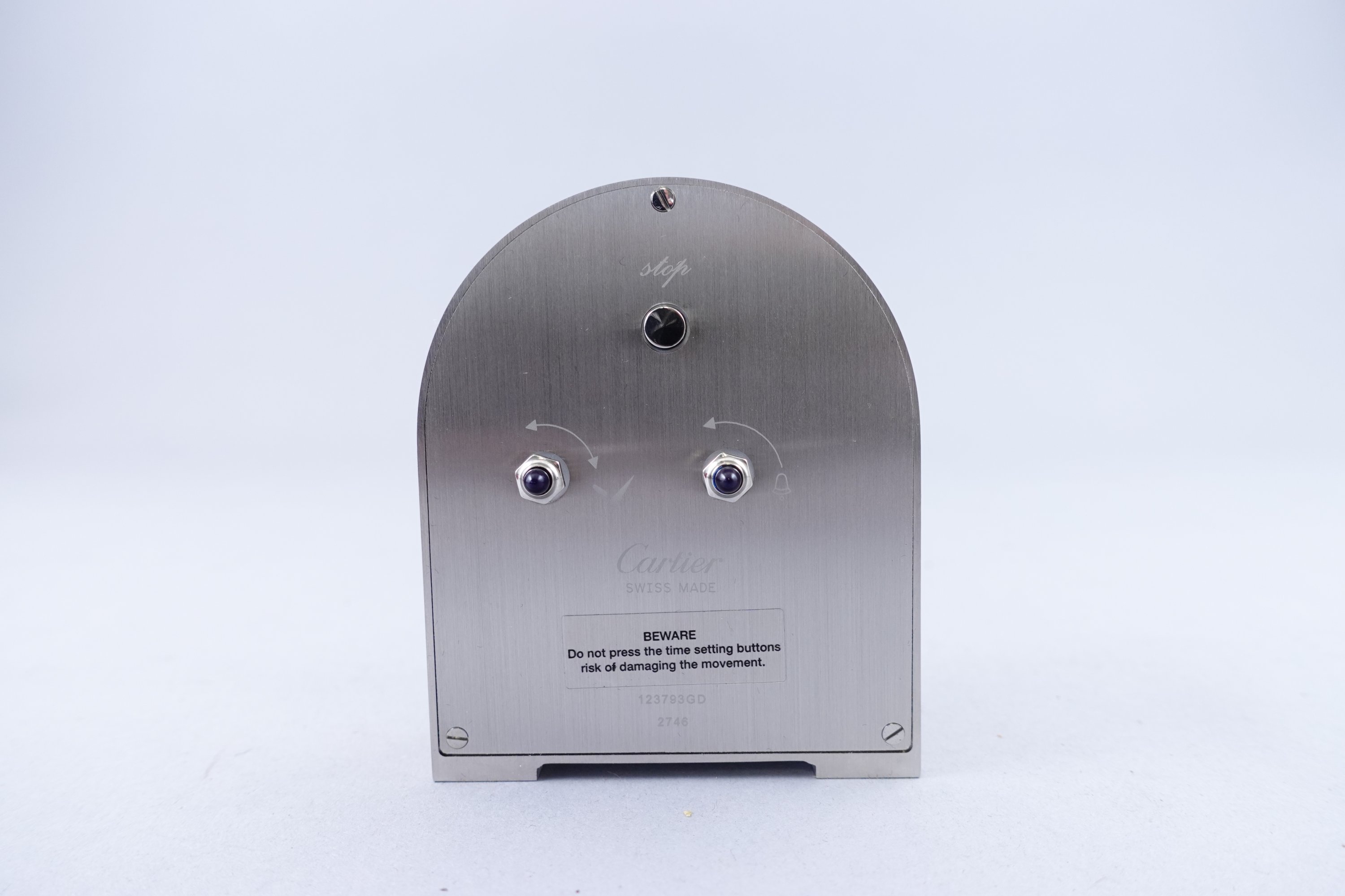 en acier à décor ondoyant sur fond guilloché. Le cadran à fond ivoire est signé "Cartier" et indique les heures en chiffres romains, les minutes par un chemin de fer. Numérotée "123793GD". Mouvement à quartz.