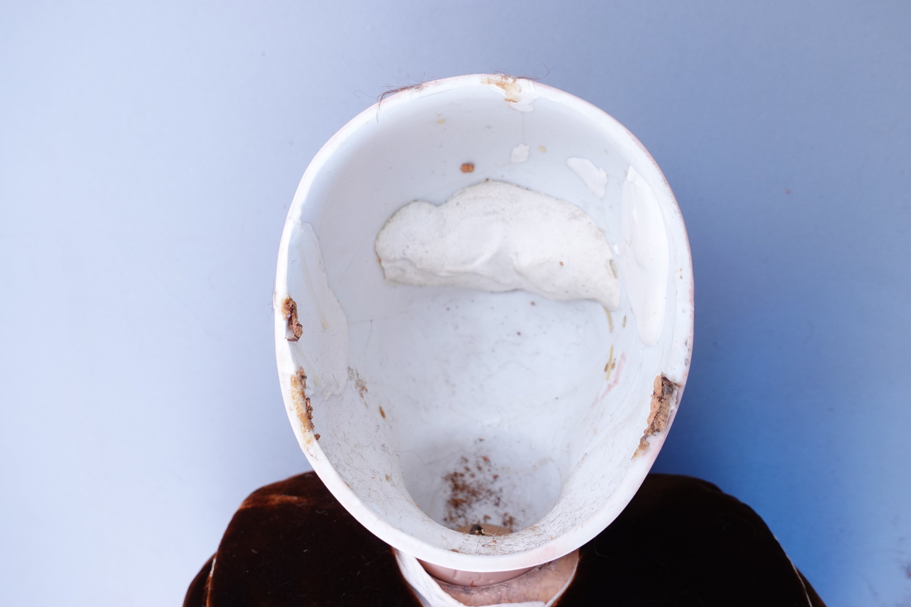 Tête en biscuit pressé. Taille 13, marquée "13". Oreilles rapportées et percées, yeux de sulfure bleus. Beau corps tout articulé à poignets fixes. Habits de style et perruque.