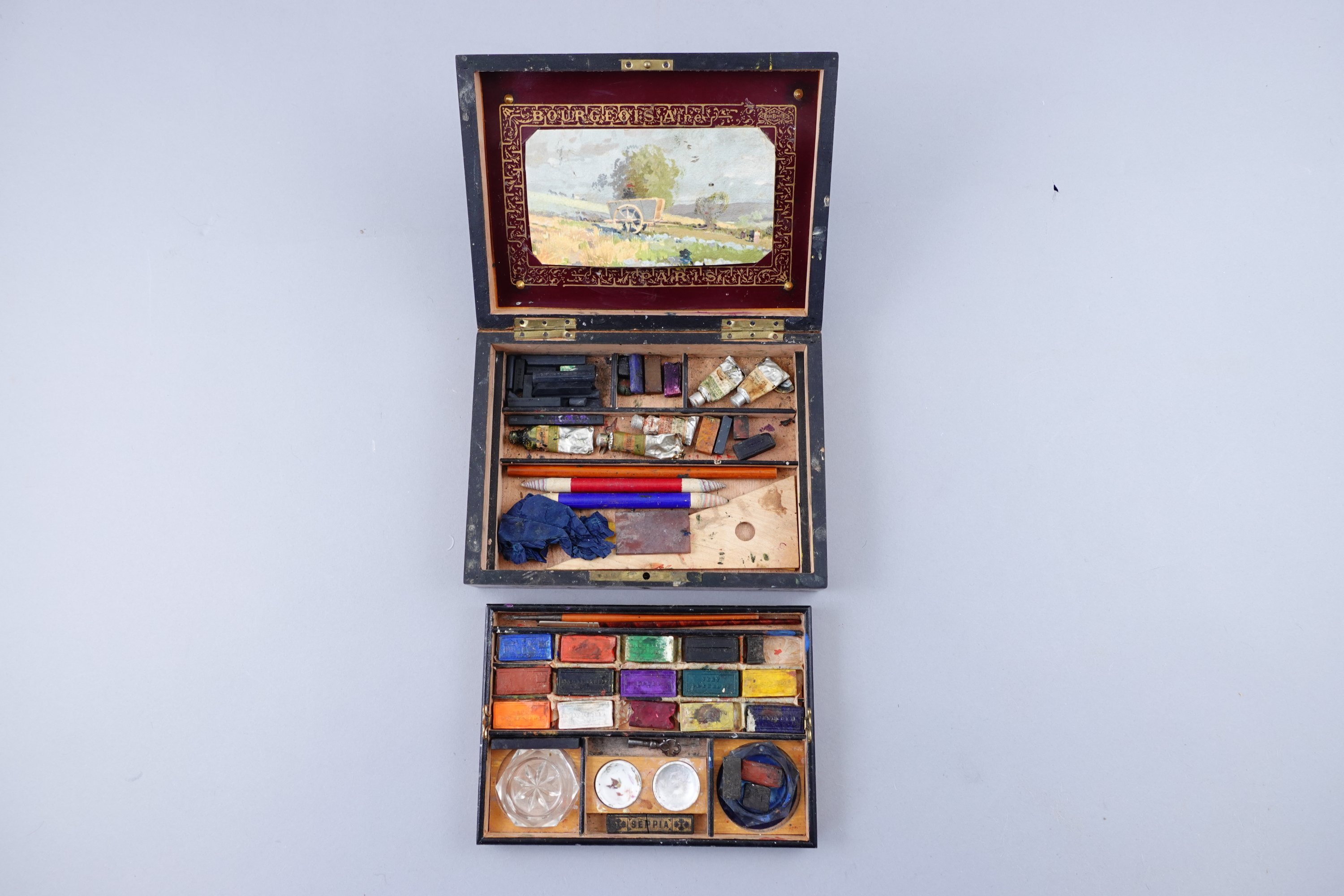 dans sa boîte en bois à marqueterie de cubes, comprenant des pinceaux, blocs d'aquarelle et deux petits pots à eaux.