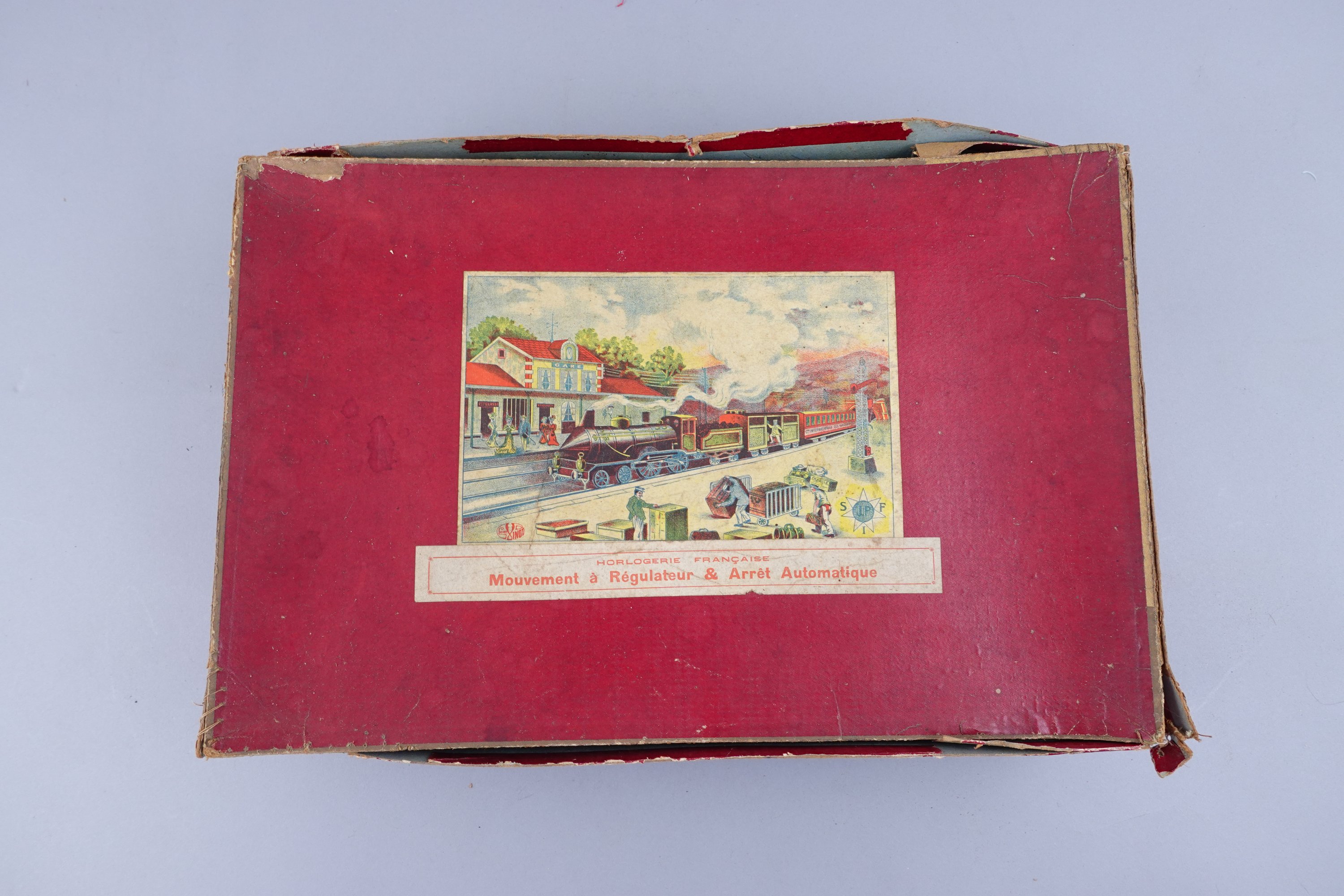- "Le Jouet de Paris", une boîte de la collection "Train de luxe et circuit transformable", vers 1930, une locomotive mécanique type 020 à écart 0, verte et noire avec liserets doré et rouge avec tender, une voiture à essieux, six rails courbes, siglés "S.I.F" et "J.P", un passage à niveau et une cabine de gare. Long. 44 Larg. 28 cm pour la boîte.