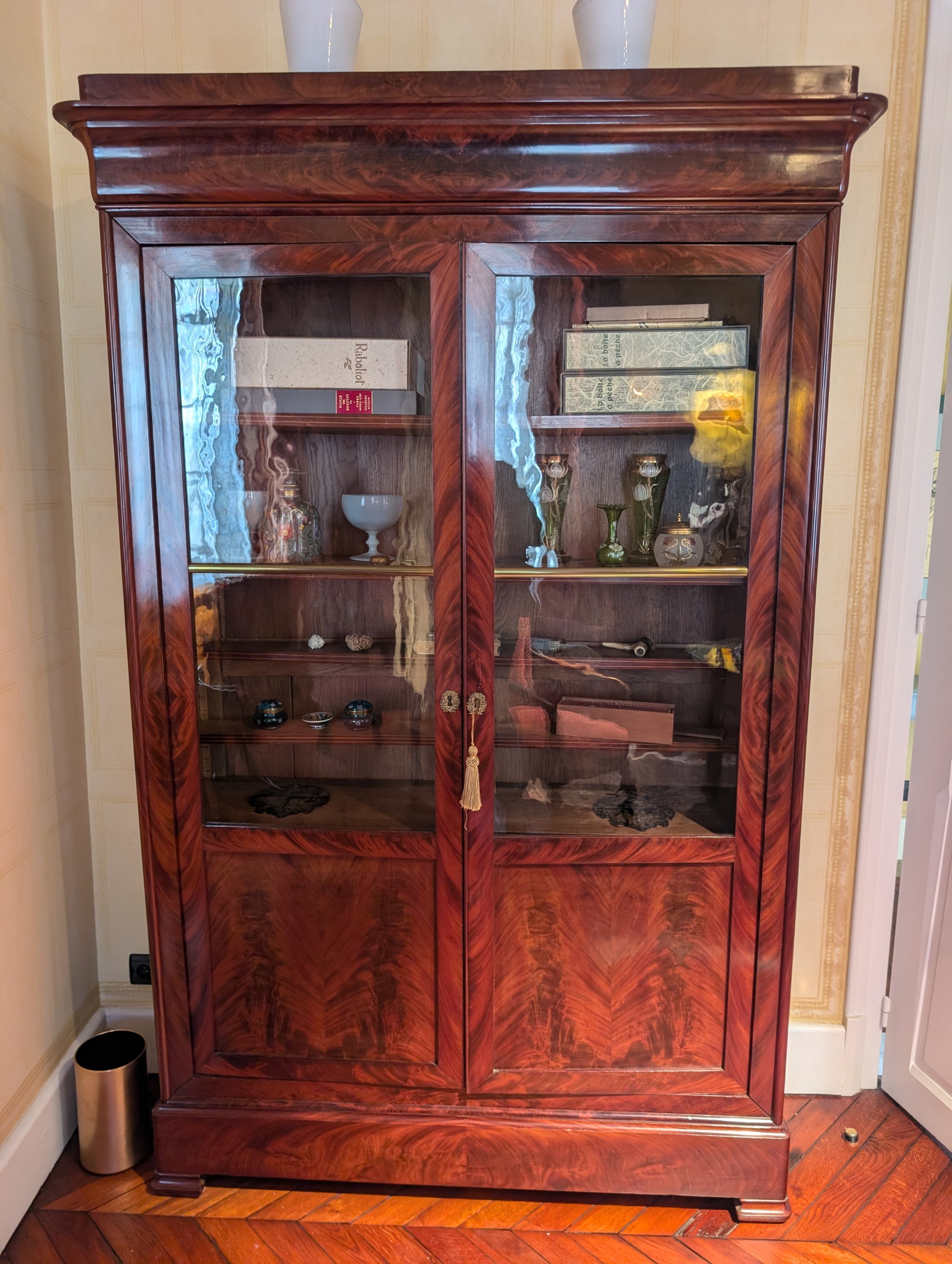 en acajou et placage d'acajou flammé. La partie supérieure à corniche, deux portes vitrées.
