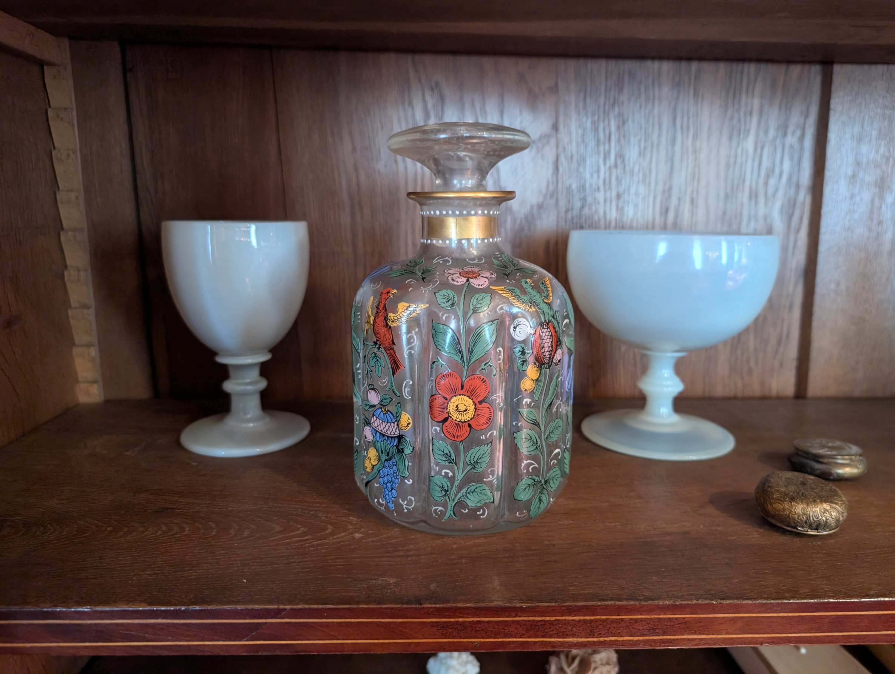 en verre à panse godronnée à décor peint émaillé de motifs végétaux et oiseaux.