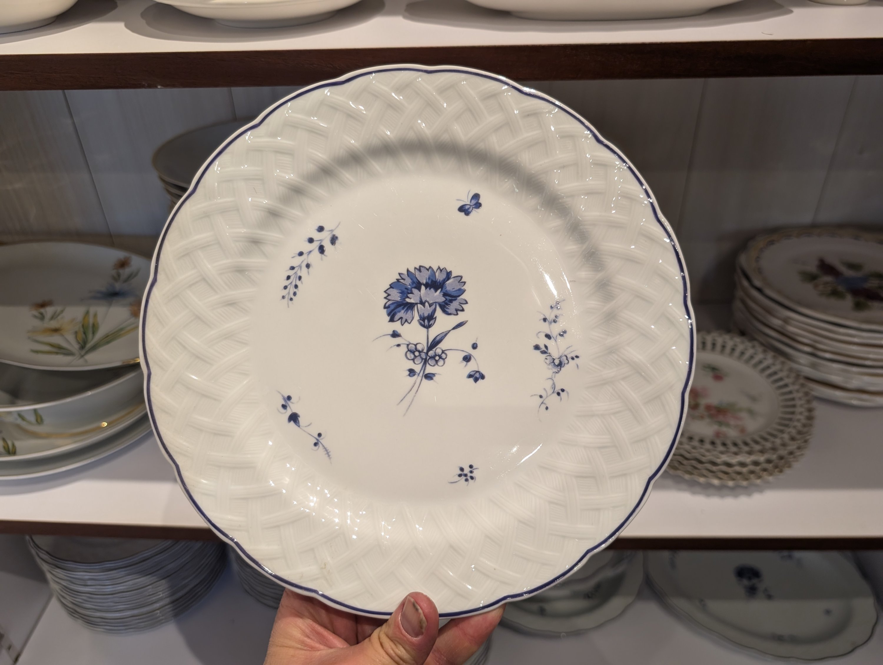 en porcelaine comprenant assiettes plates, assiettes creuses, saucière, soupière, plat creux et plat oblong.