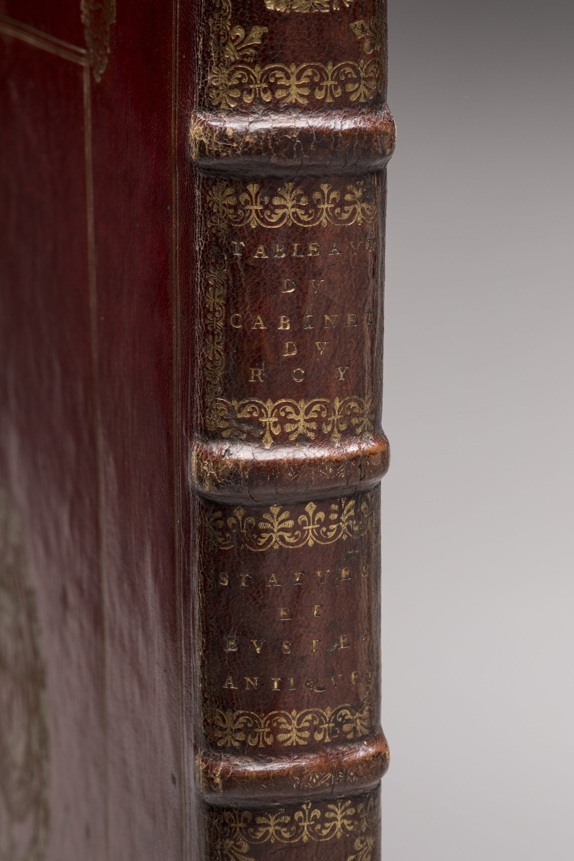 Grand in-folio (540 X 390 mm). Titre et 18 pages de texte, 32 planches de tableaux, un bon nombre sur double page (par divers ; datées de 1677 à 1682) ; 60 planches de sculptures (par Mellan, datées de 1669 à 1675, ou par Baudet, datées de 1677 à 1681). Plein maroquin rouge, double encadrement de filets droits avec fers armoriés dans les angles de l'encadrement intérieur ; grandes armes royales au centre des plats. Dos très orné de fers royaux dans les entre-nerfs.