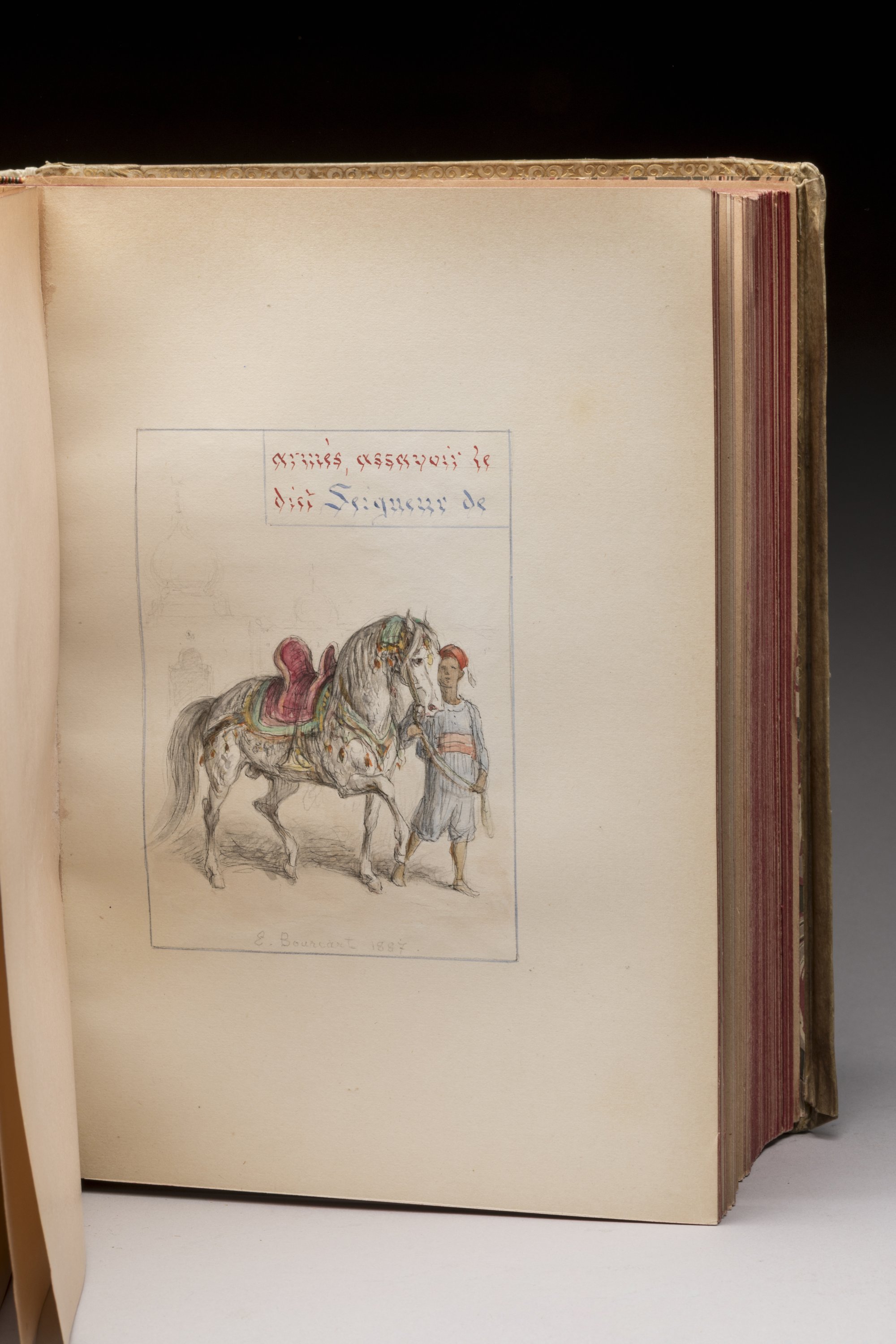 Le recto de chacun des 93 premiers feuillets est orné de 93 aquarelles, gouaches, dessins au crayon ou à l'encre de Chine, de différentes mains, souvent à pleine page ; au verso, texte calligraphié à l'encre bleue ou rouge, avec lettrines et rinceaux à la gouache. Les derniers feuillets renferment la liste des artistes ayant participé à l'illustration et, en guise de colophon, la phrase : "Ce manuscrit a été terminé le 15 mai 1888. Baron B.".