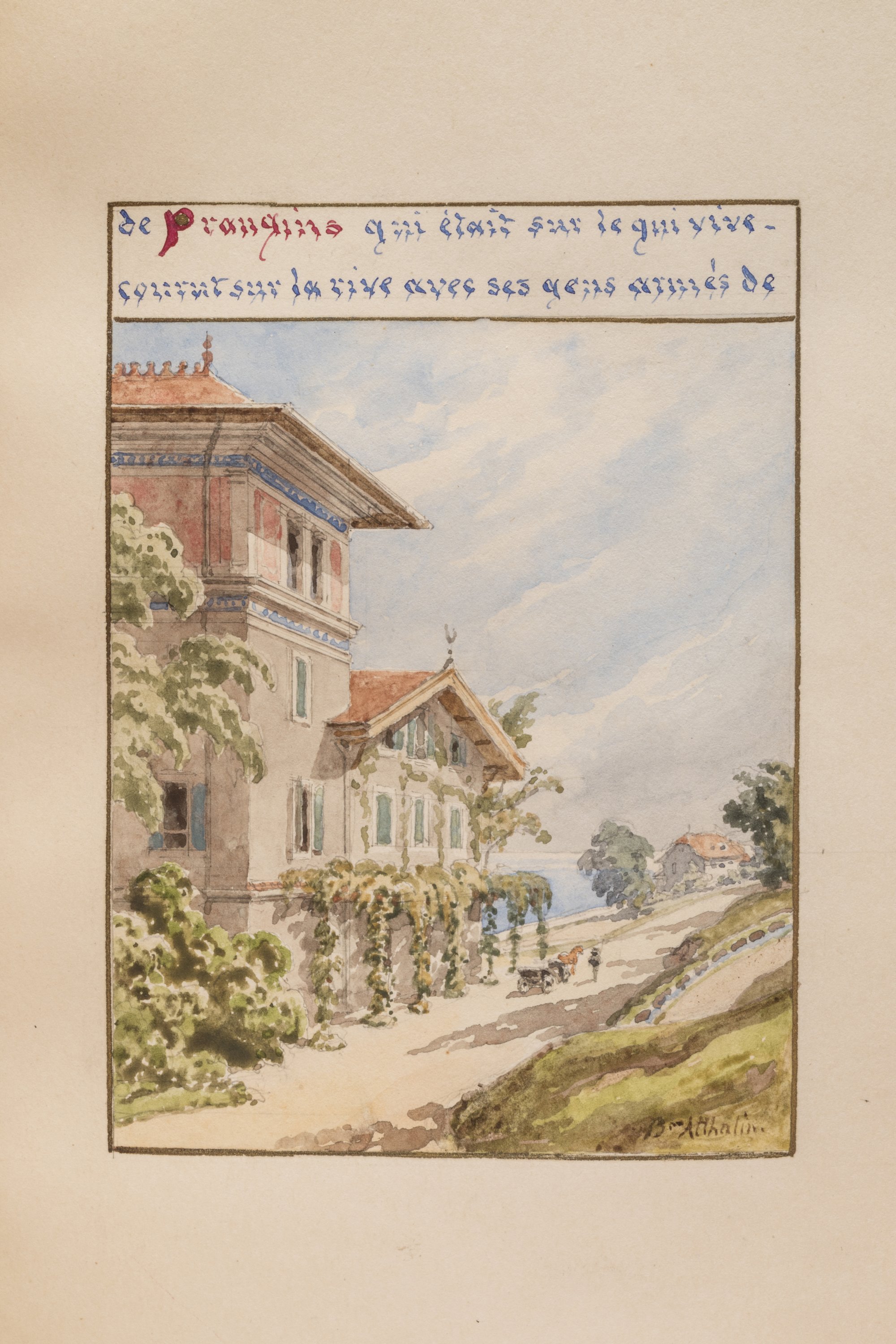 Le manuscrit, soigneusement calligraphié en lettres gothiques cursives, est très abondamment illustré. Les artistes contributeurs sont tous nommés. Ce sont vraisemblablement, pour la plupart, des proches du Baron Bouvier d'Yvoire, partageant ses idées politiques "catholiques libérales" (Alfred Dumont), des membres de familles alliées de diverses provinces (Rozat de Mandres), des notables de la Haute Savoie et de la région du Lac Léman (Maurice Bourcart, médecin et membre du Cercle des Artistes de Genève). A remarquer aussi le nom de Charles Cottet (peut-être le grand peintre Charles Cottet, 1863-1925, issu d'une famille savoyarde). Près d'un tiers des illustrations est réalisé par des femmes : Augustine Bouvier, Gabrielle et Suzanne Thiébaud, la comtesse de Faras, la comtesse de La Bédoyère, Joséphine Braendlin, la baronne de Villette et quelques autres.