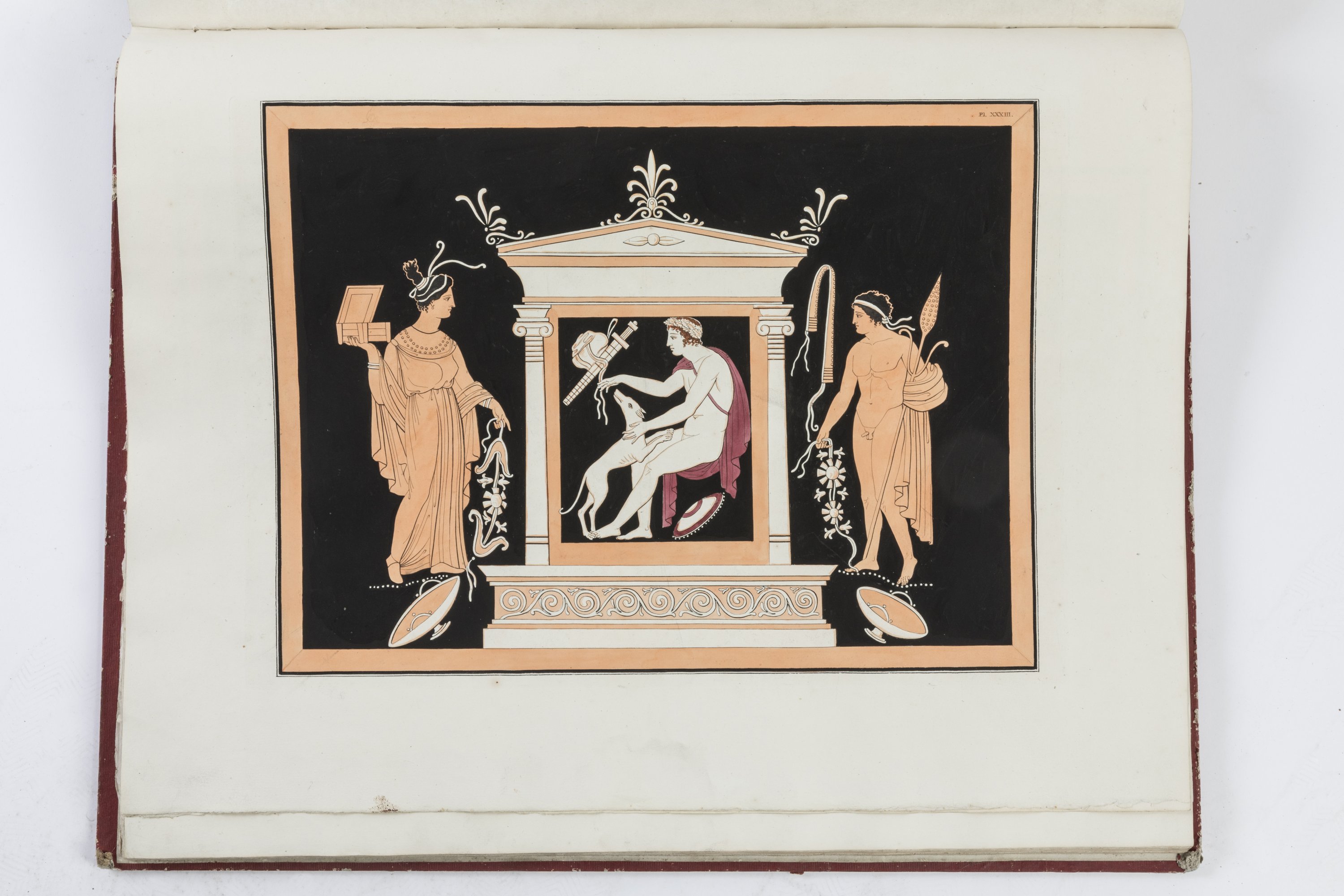 Ce somptueux ouvrage, dédié par l'éditeur, Charles-Marie Dubois Maisonneuve (Tours 1772-1838), à "Sa Majesté l'Impératrice-Reine", décrit et reproduit environ 120 vases dits "Etrusques" appartenant à des collections privées, dont une trentaine appartient d'ailleurs à Joséphine elle-même. Ces vases de céramique peinte ont été trouvés dans l'ancien territoire d'Etrurie, qui allait de la plaine du Pô jusqu'à Naples et Pompei, d'où leur nom "vulgaire" d'étrusque : ils sont en fait de facture grecque, soit créés dans des ateliers de la Grande Grèce, soit importés de Grèce en échange de métaux et de blé, du VIIe au Ve siècle avant notre ère.