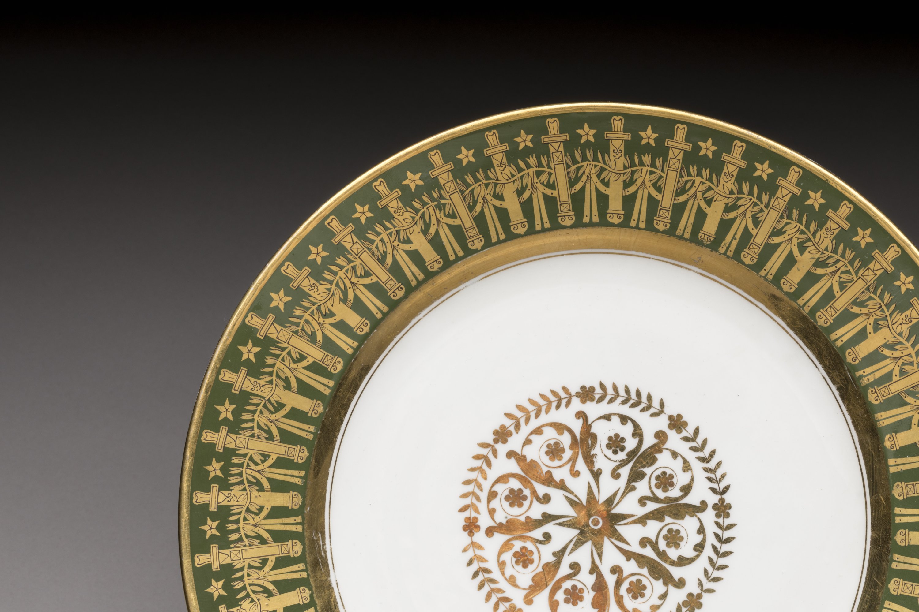 Porcelaine dure à décor en or au centre d’une rosace cernée d’une guirlande de feuillage et sur l’aile d’une frise de glaives réunis par des rubans, guirlande de laurier et étoile à cinq branches sur fond vert de chrome.