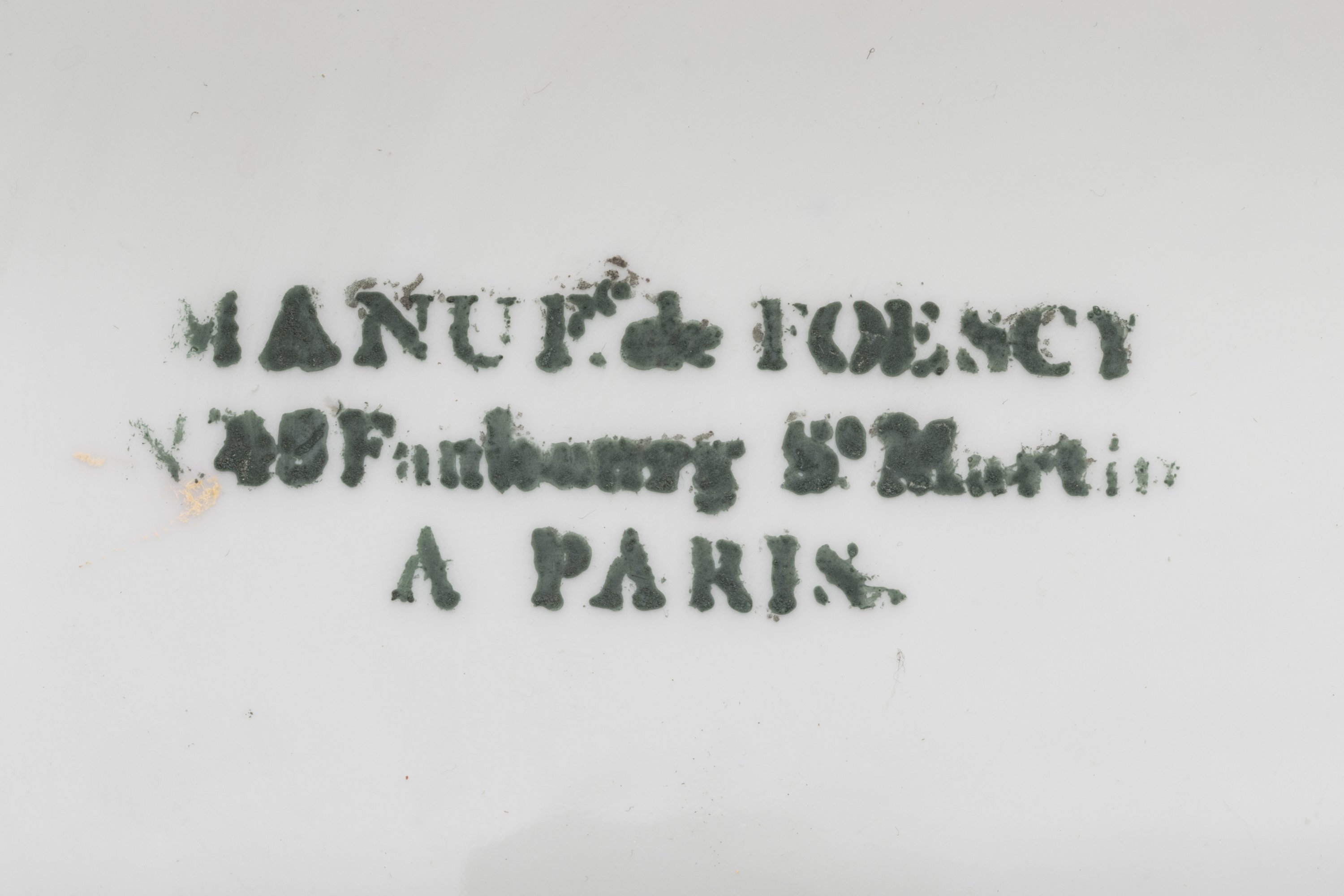 Le service particulier de l’Empereur est commencé en 1807 et livré le 27 avril 1810 au Palais des Tuileries, avant le mariage impérial le 2 avril 1810. Il comportait 72 assiettes à dessert peintes, 24 assiettes à potage et 24 assiettes à dessert nommées assiettes à monter à bordure seulement. Ces assiettes en porcelaine de Sèvres portant la marque de Foescy font partie des quelques pièces de complément aujourd’hui connues. Certaines font sans doute partie des quatre assiettes livrées le 30 janvier 1812 à Son Excellence le Grand Maréchal du Palais, (arch. Sèvres, Cité de la céramique, Vy21, f° 3 v)