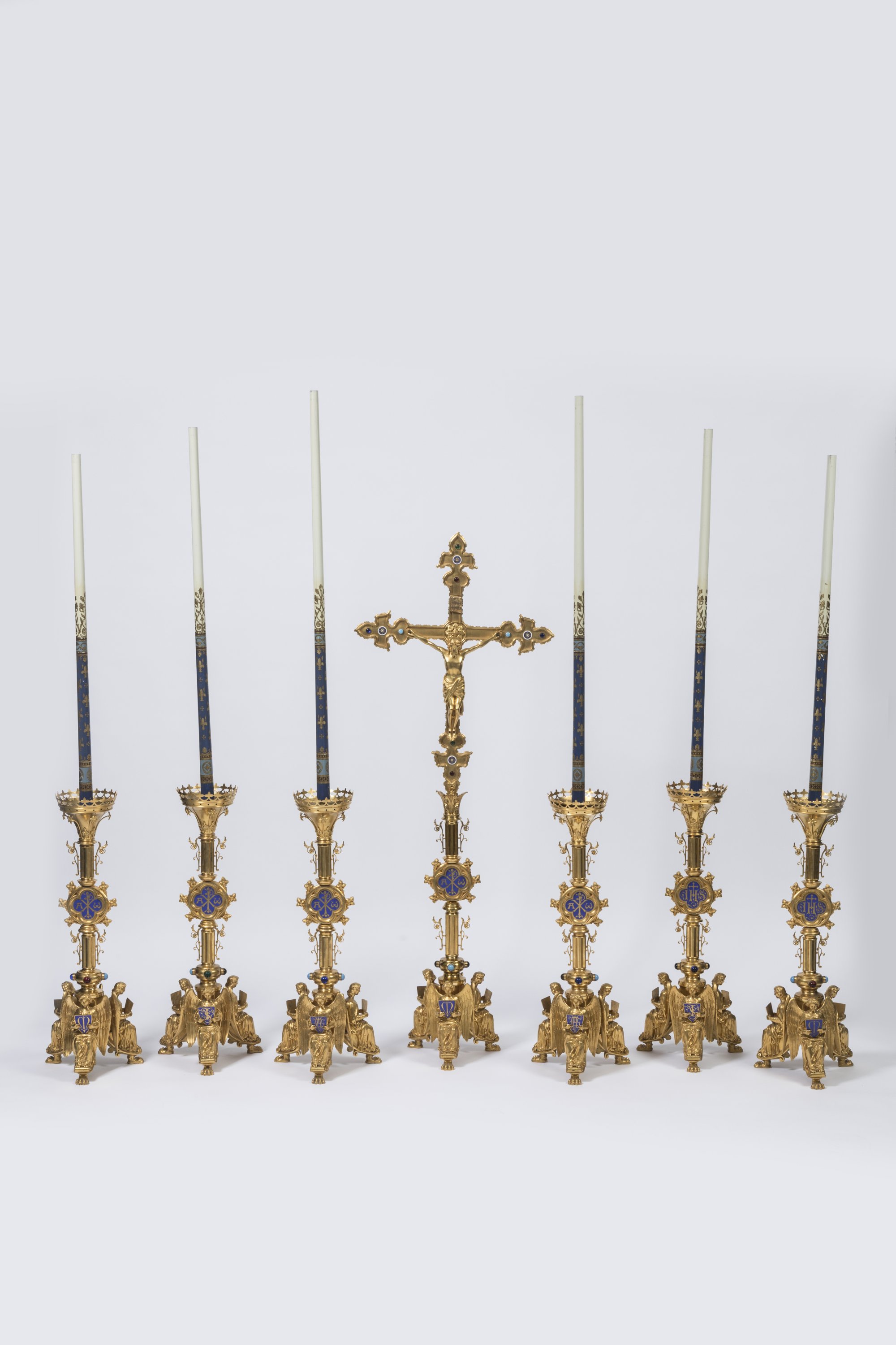 Comprenant une croix et six chandeliers garnis de leurs cierges fleurdelysés en tôle peinte. Les fûts cannelés sont parés de rosaces aux monogrammes du Christ ou de l’Alpha et l’Omega. Ils sont terminés par une bague aux cabochons turquoises, grenats ou verts. Les piétements sont décorés de trois archanges assis sur des griffes de lion tenant chacun un écusson.