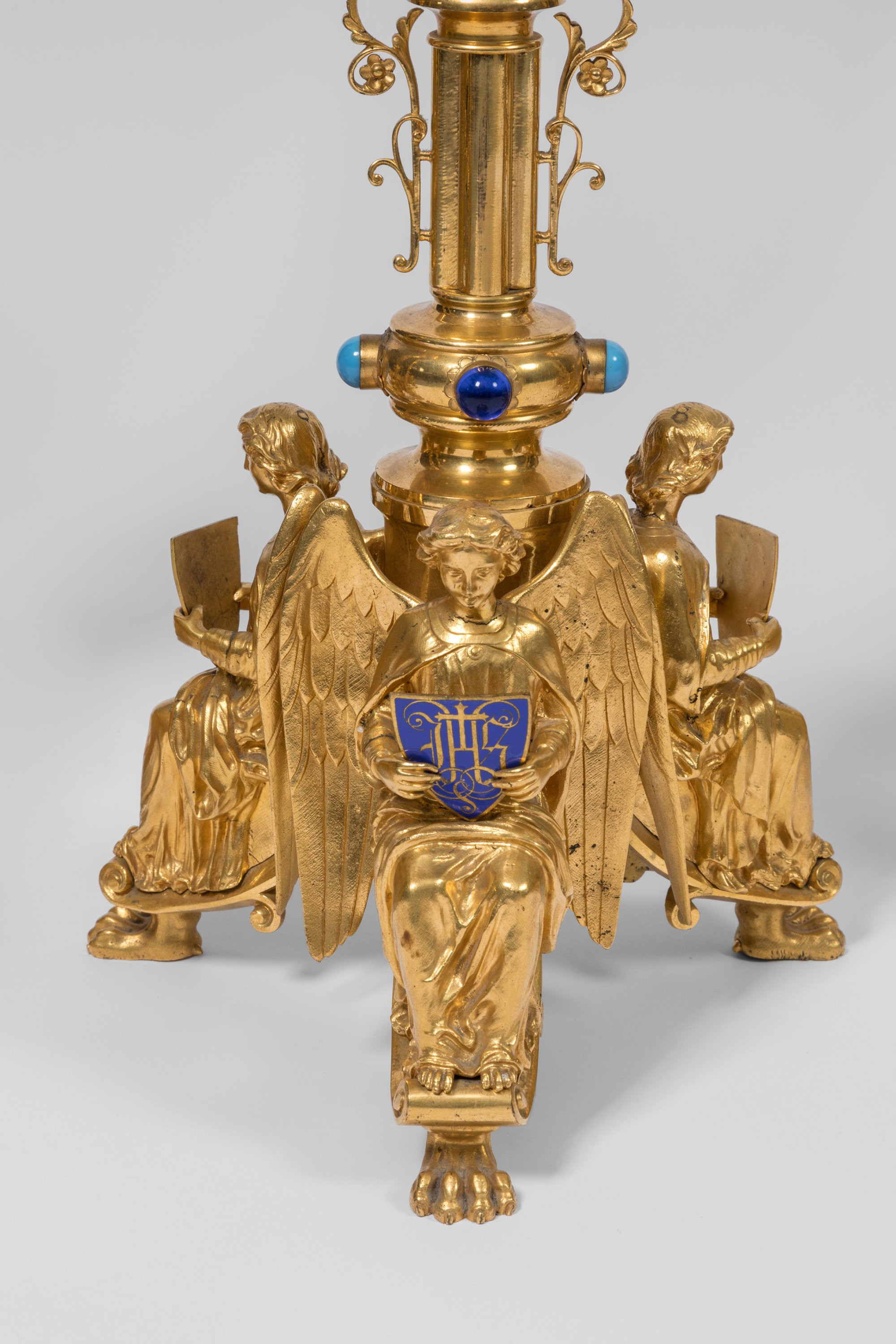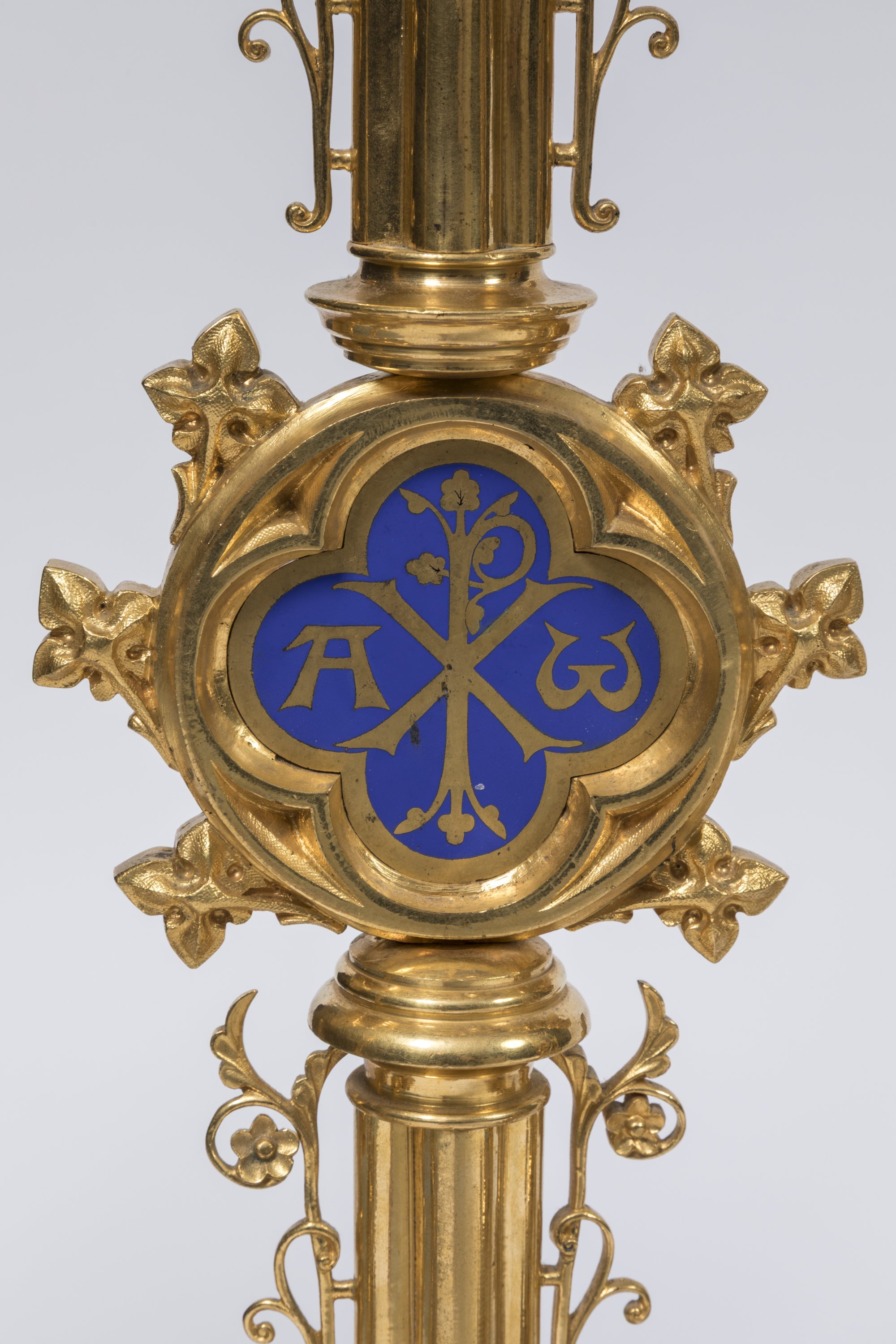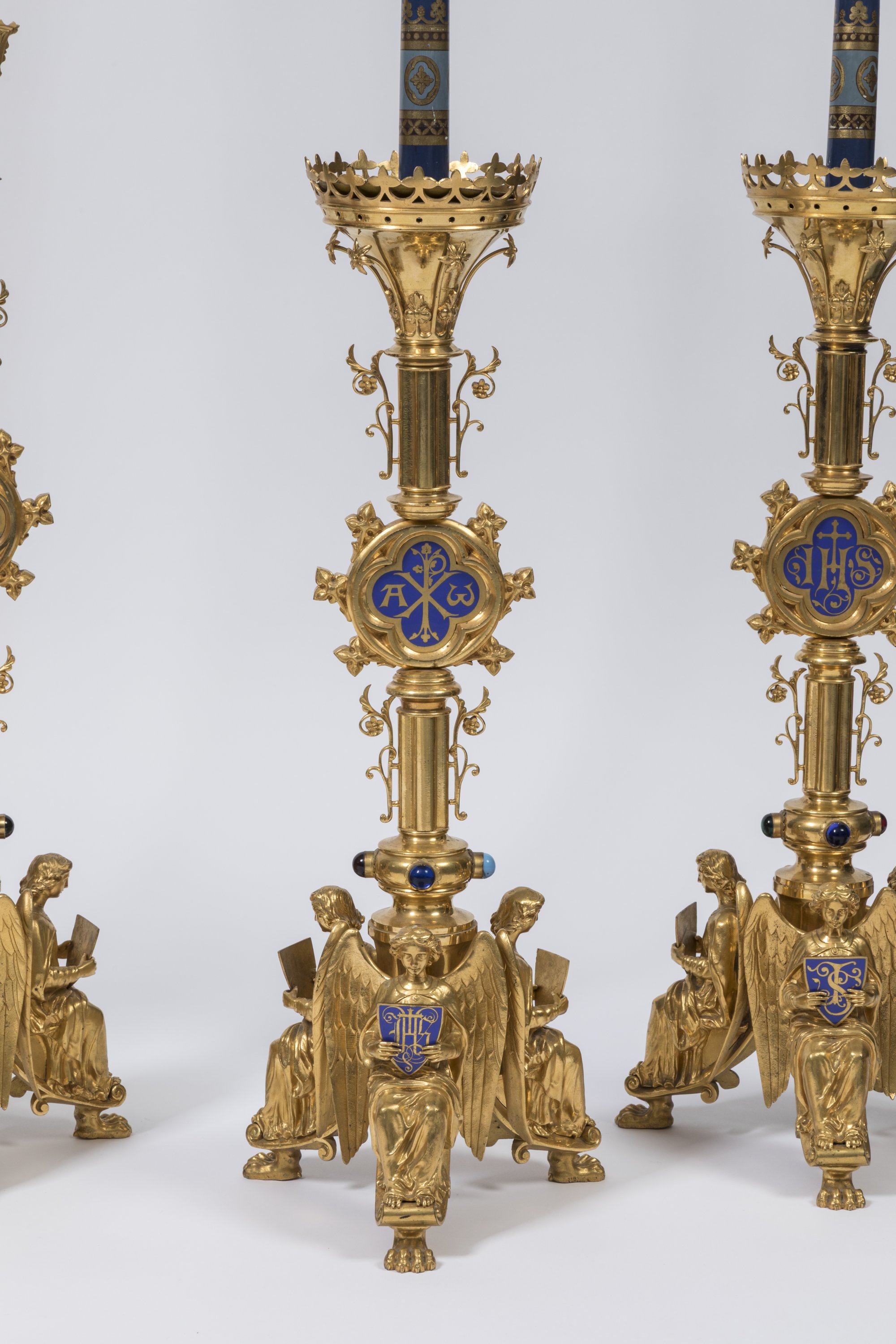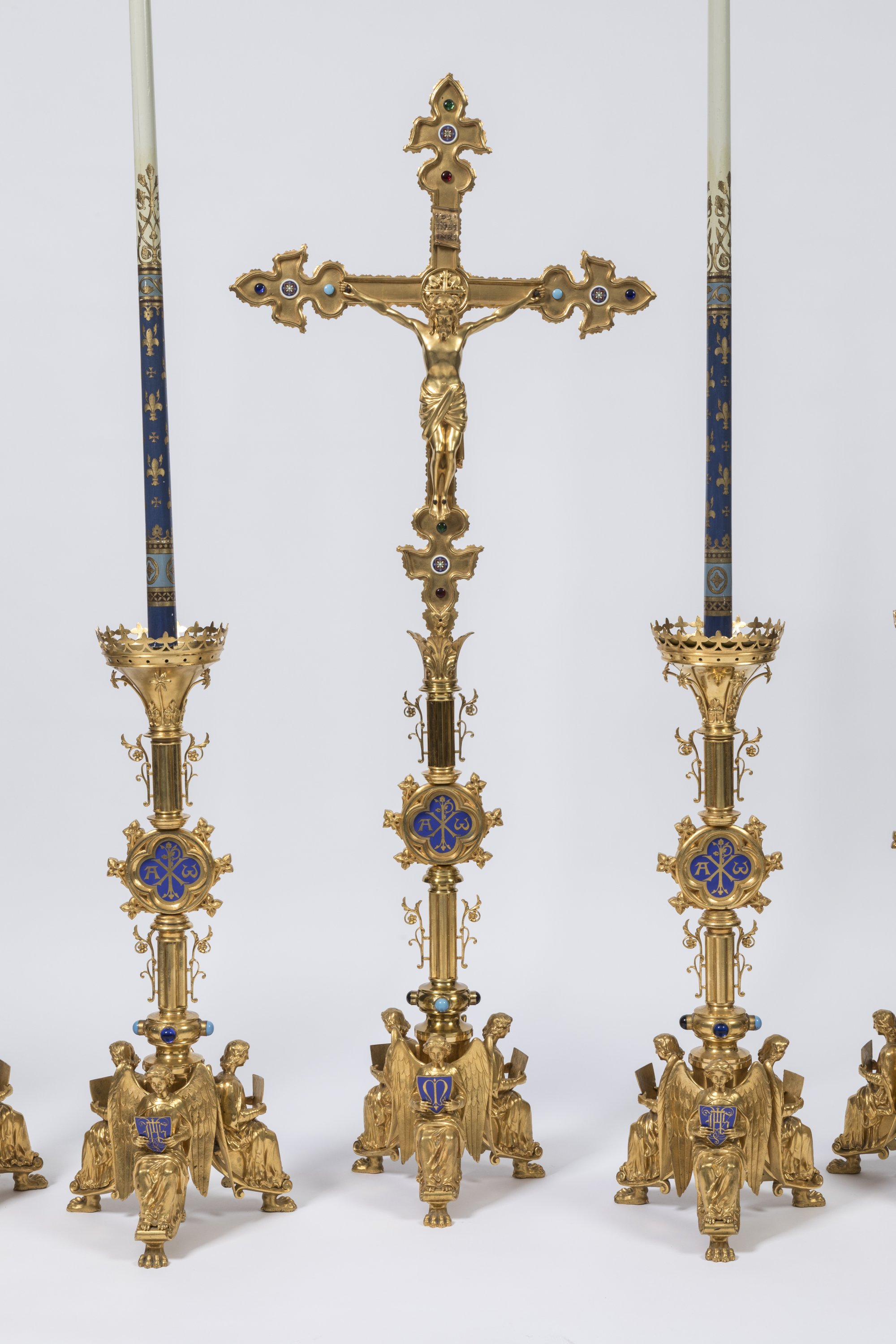 An ormolu altar cross and six candlesticks decorated with shield-bearing archangels, semi-precious stones and cloisonné enamels. With matching painted tin candles. Second Empire Period, Gothic Revival style.