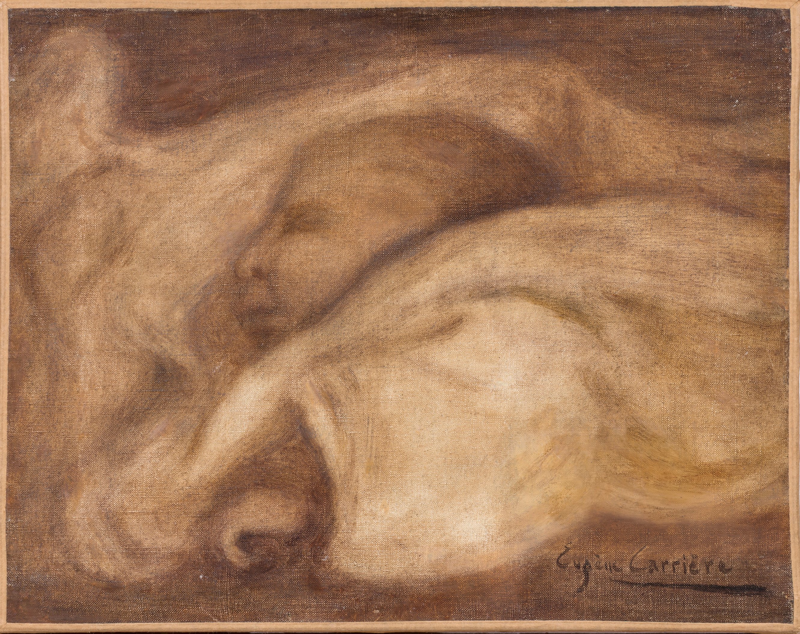 Eugène Carrière. A painting featuring a sleeping child. Oil on canvas. Signed.