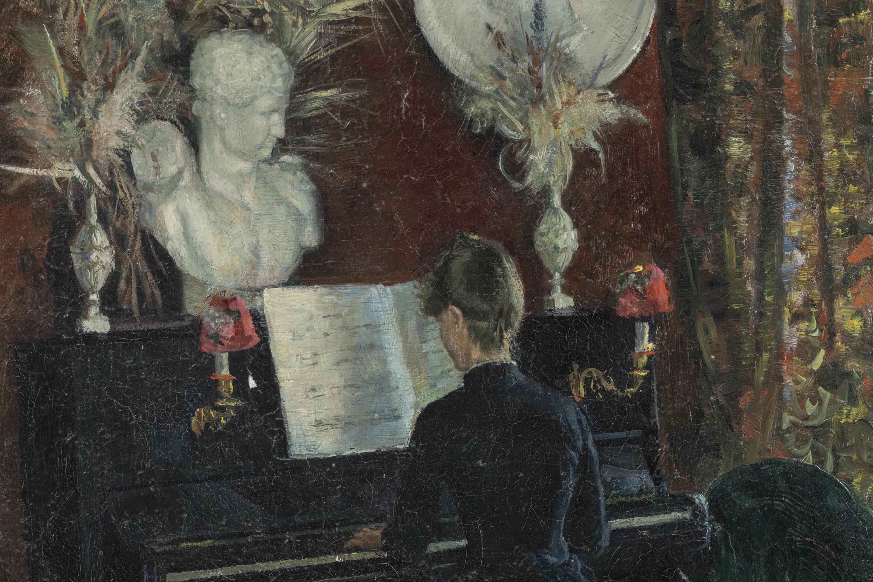 Karl Jensen-Hjell est l'un des peintres norvégiens les plus prometteurs de sa génération. Né à Kristiania - futur Oslo - en 1862, il dépasse les strictes leçons reçues aux Beaux Arts, "Tegneskolen", pour proposer une touche dans l’esprit de l’avant-garde européenne. C’est ainsi qu’il se lance dans un voyage jusqu’à Munich, qu'il poursuit vers Paris et l’Italie. Il rapporte de ces destinations un caractère naturaliste, inspiré notamment d’Edouard Manet. Revenu à Kristiania en 1887, Jensen-Hjell est l’un des chantres du mouvement bohème, revendiquant « un accent sur la vérité » et une liberté d’expression à travers la facture ». Son cercle se compose notamment de Gustav Wentzel et d'Edvard Munch, dont ce dernier livre dès 1885 son portrait en pied traduisant sa « confiance insolente ». S’il est dépeint comme « hautain, d'une élégance minable, plein d’assurance », ses rares tableaux d’intérieur transcrivent a contrario le confort et la chaleur de l’intimité des foyers norvégiens dans la décennie 1880. Cette femme au piano est dépeinte de dos dans un environnement bourgeois où se côtoient buste en marbre et portrait en médaillon. L’intériorité du modèle semble alors se refléter dans l’environnement qui l’entoure, à l’instar des autres toiles d'un corpus restreint. L’artiste meurt en effet l’année suivante, à seulement 25 ans, des suites de la tuberculose.