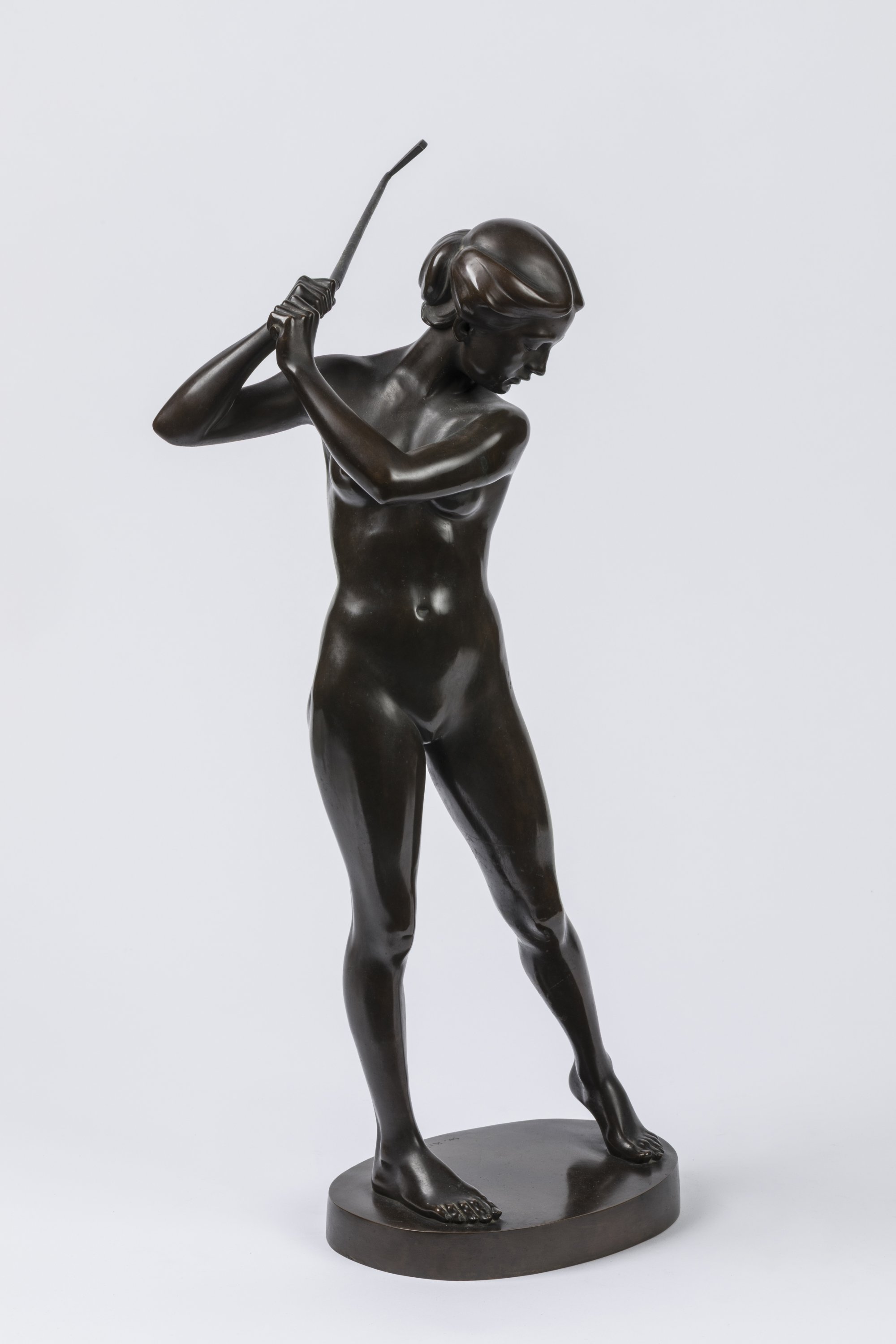Wilhelm Krieger. A ca. 1910 bronze sculpture of a naked female golf player. Signed.