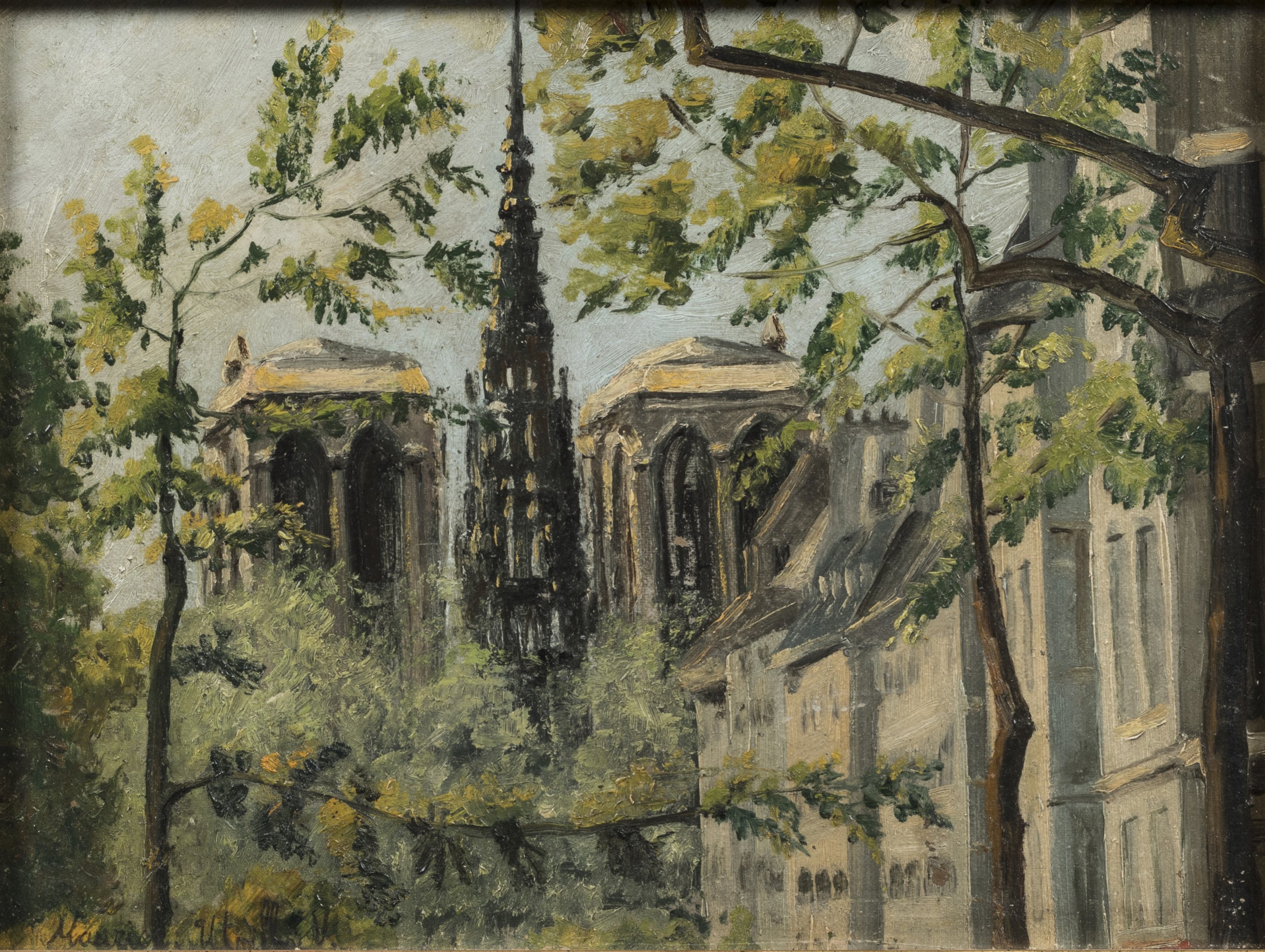 A partir de 1910, Maurice Utrillo décide de se tourner vers des compositions de plus grande ampleur. Il reproduit ainsi de nombreuses églises de région parisienne, comme l’église de Clignancourt ou la Cathédrale de Rouen. L’influence de Claude Monet est particulièrement prégnante sur l’un des plus fameux tableaux de cette série, « Notre Dame », peint dès 1909 et aujourd’hui conservé au musée de l’Orangerie à Paris (n°1963 103). Réalisée en 1919, cette vue de Notre Dame de Paris est totalement inédite. La flèche et les tours de la cathédrale avec le transept nord sont saisis entre les feuilles des floraisons printanières depuis le jardin de l’archevêché. Le monument émerge, presque comme par miracle, au milieu d'un camaïeu de vert. A mi-chemin entre sa période blanche et sa période colorée, comme en atteste la place accordée à la végétation et la teinte gris-beige des pierres, cette toile s'inscrit à un moment particulièrement difficile pour Utrillo, qui enchaîne les internements dans la clinique du docteur d'Allone, rue de Picpus, et triomphe dans le même temps aux enchères et dans les galeries, notamment en décembre 1919, célébré par sa deuxième exposition personnelle, chez Lepoutre, rue de La Boétie.