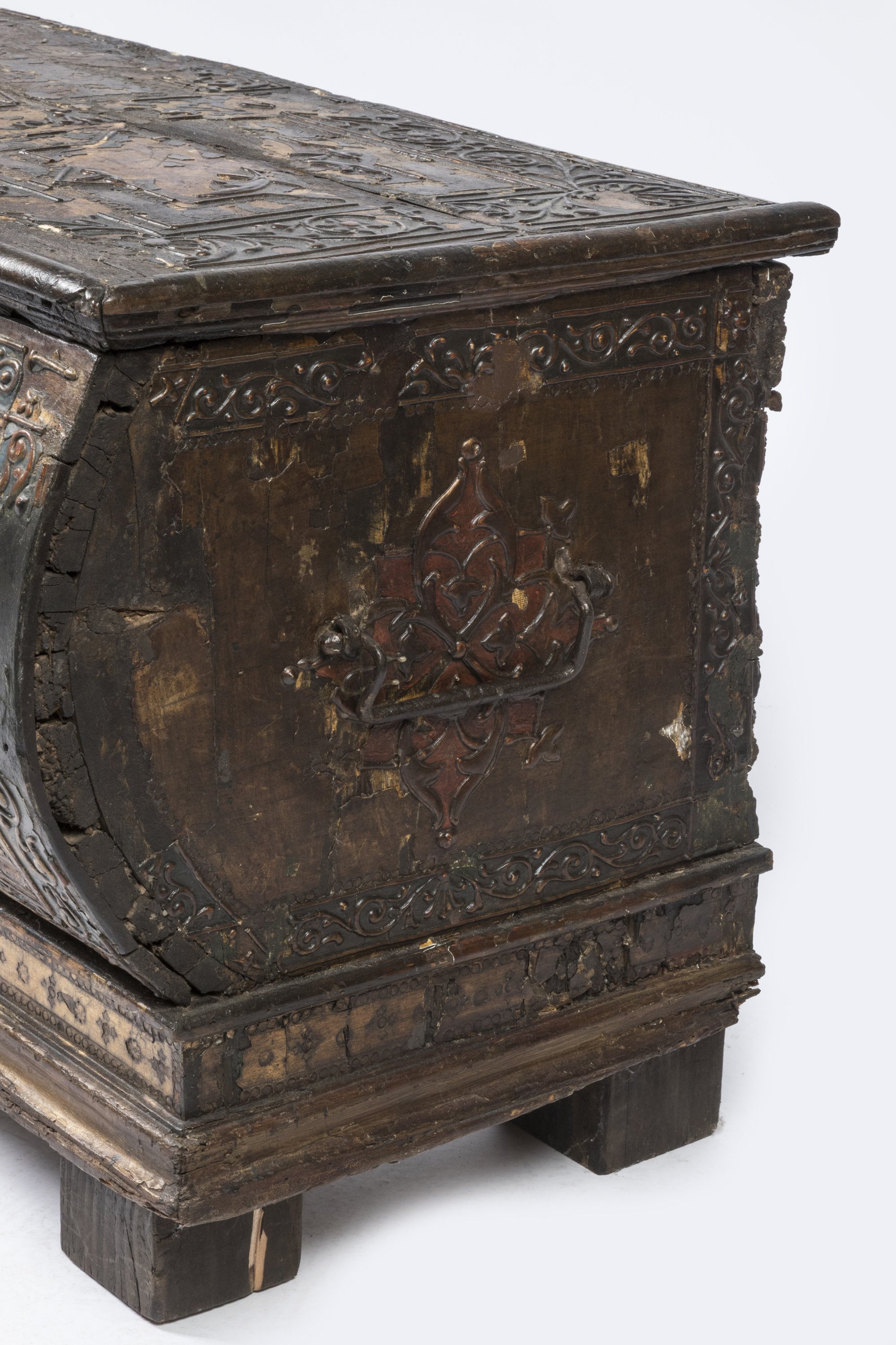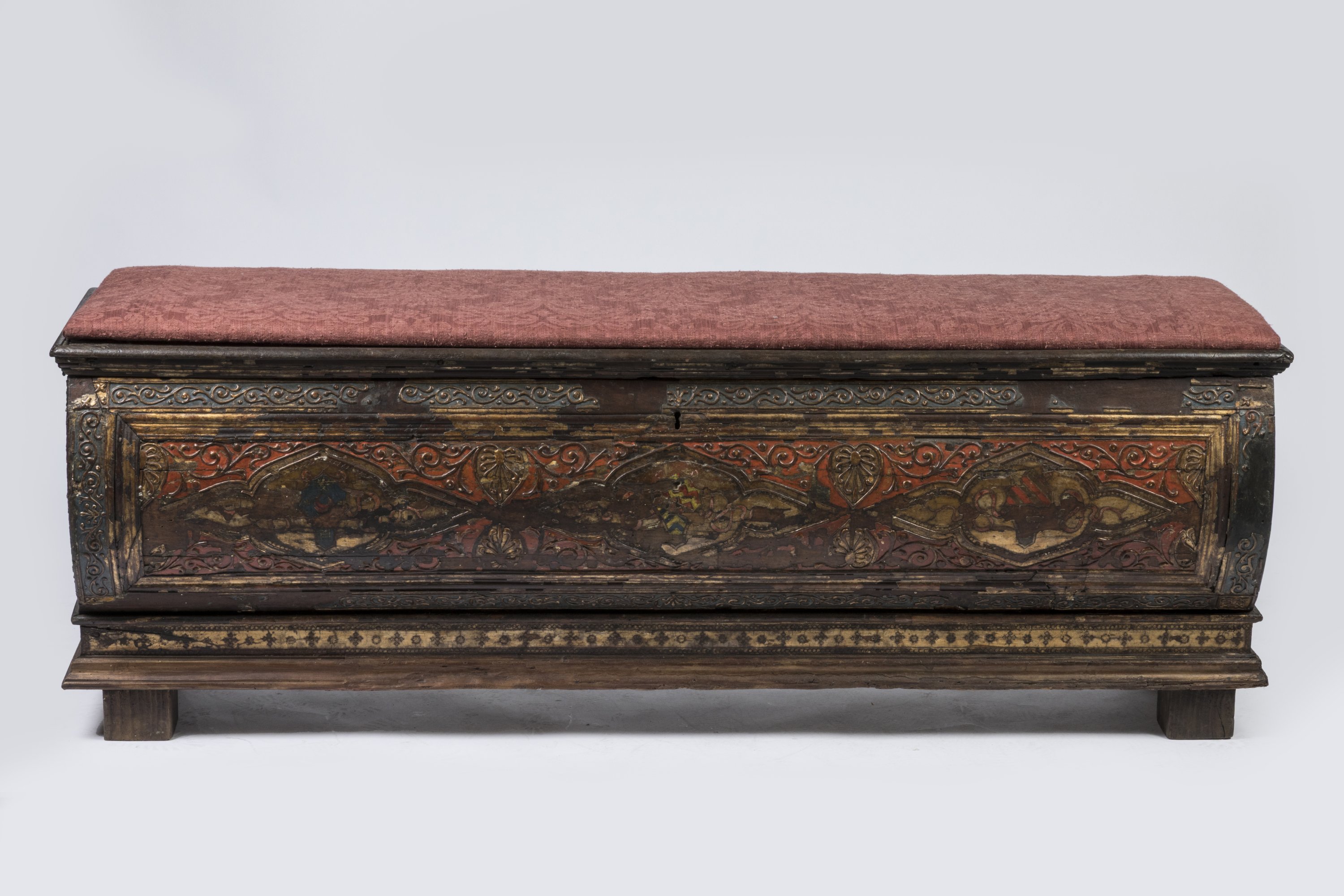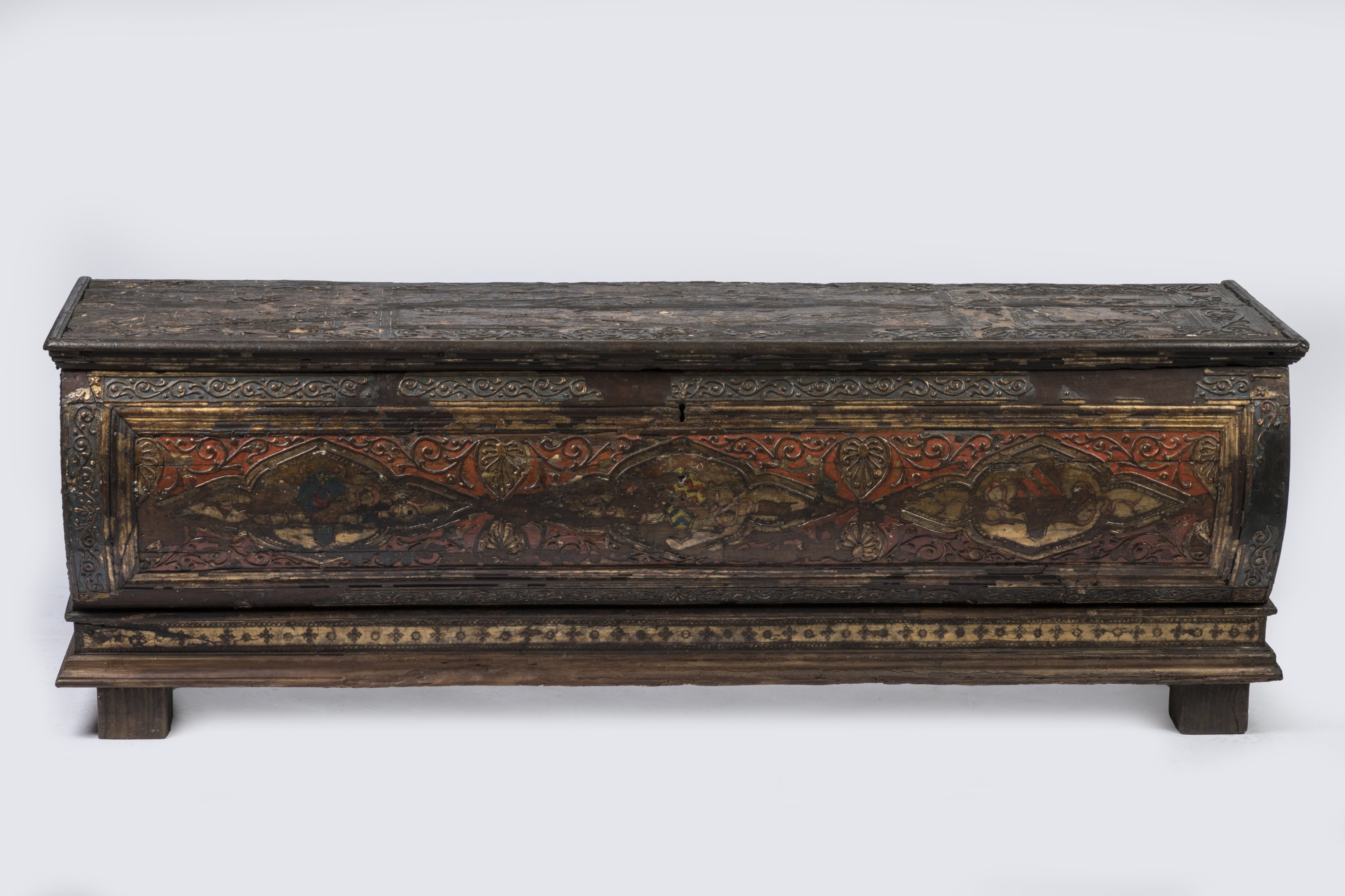 A carved giltwood and polychrome painted trunk with decorated panels. On a moulded wood base. Northern Italy, 16th century.
