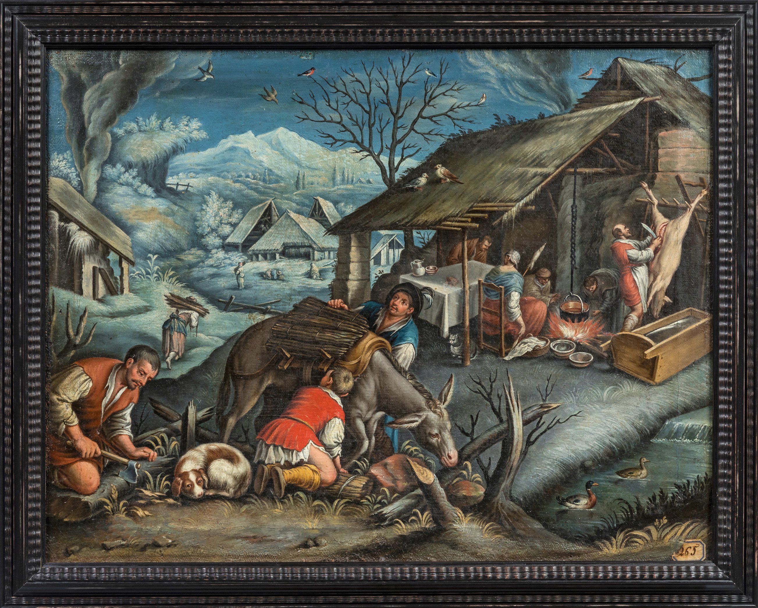 A set of paintings depicting the four seasons after Jacopo Bassano. Oil on original canvas. Flemish School ca. 1700.