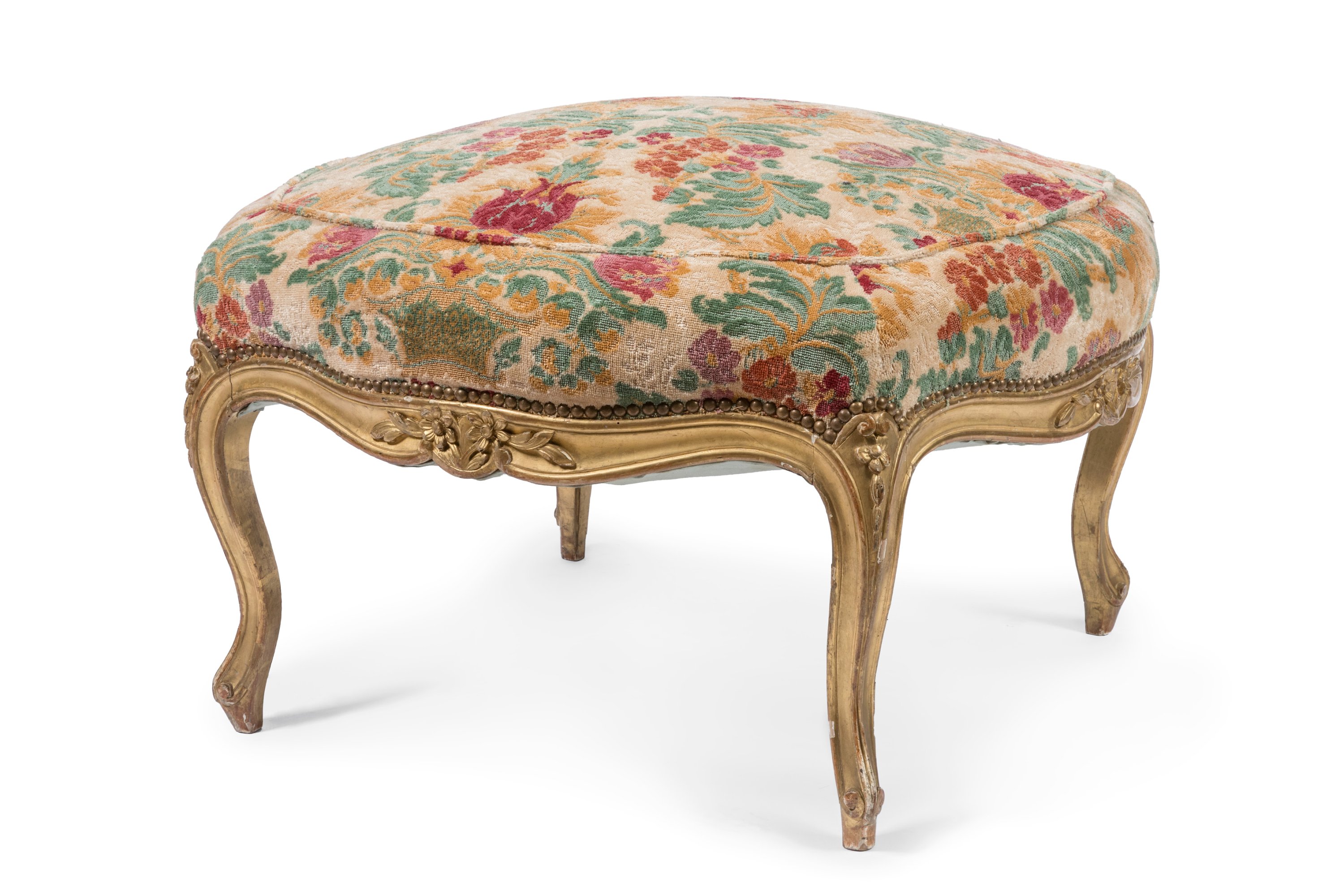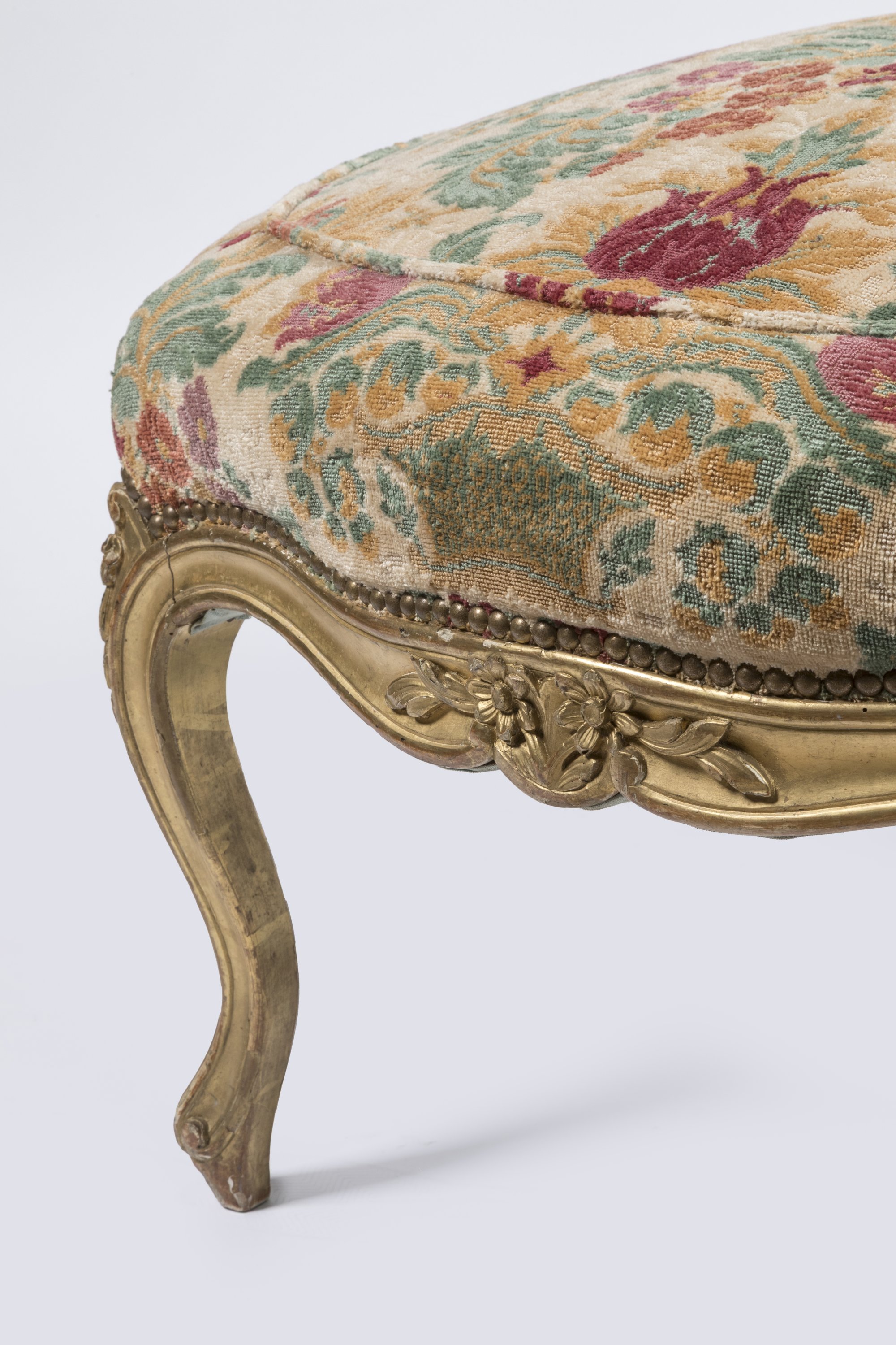 Large round carved and moulded giltwood stool with floral upholstery. Louis XV style, 19th century.