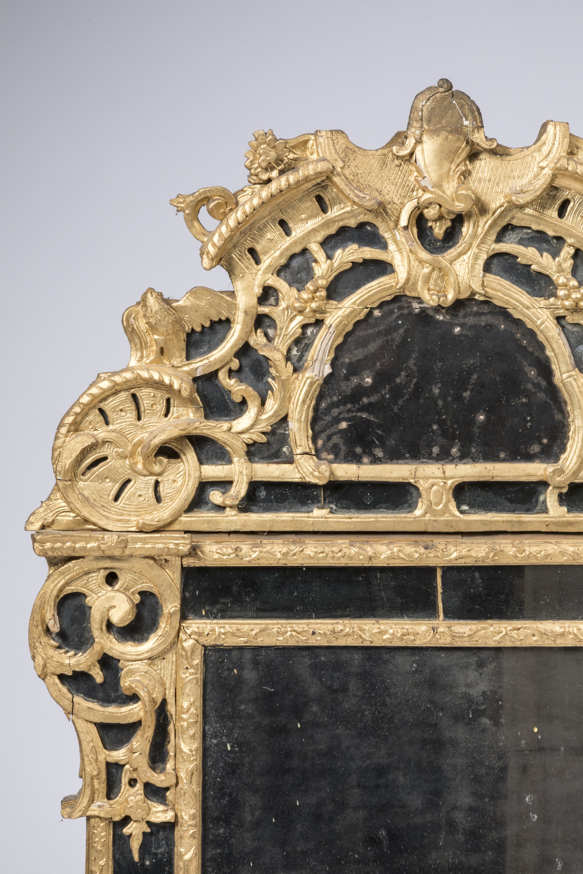 Le fronton en arc de cercle est animé d'oiseaux sur des coquilles et motif rocaille se prolongeant sur les encadrements ornés d'agrafes en enroulement d'acanthe soulignant des baguettes "à la Berain". Un panier fleuri en partie inférieure clôt la composition.
