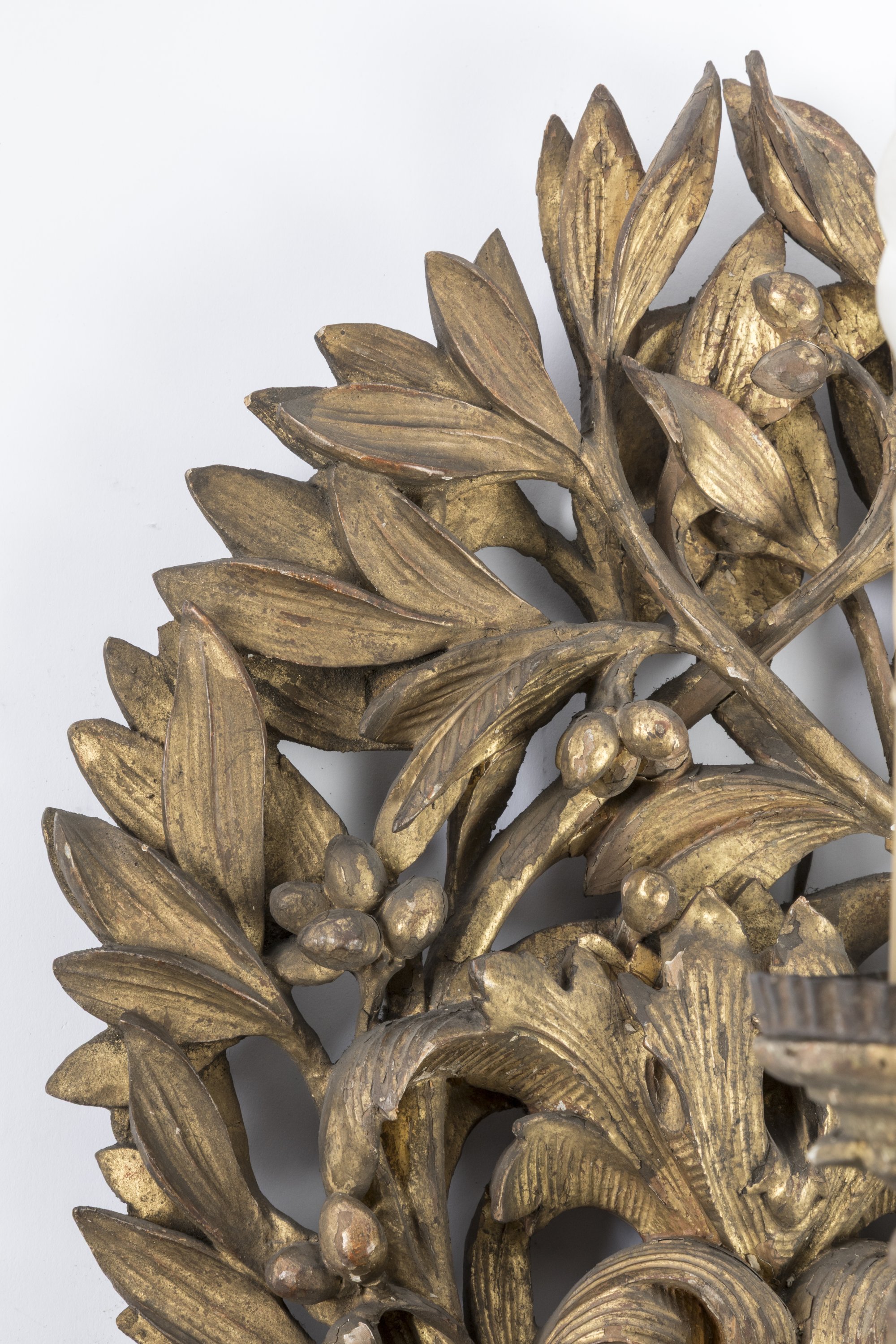 Un décor de coquille dans un entourage de feuilles de laurier reçoit le bras de lumière à feuilles d'acanthe terminé sur l'une par un protomée de lion, sur l'autre en bouquet de feuilles d'acanthe dans un entourage de laurier.