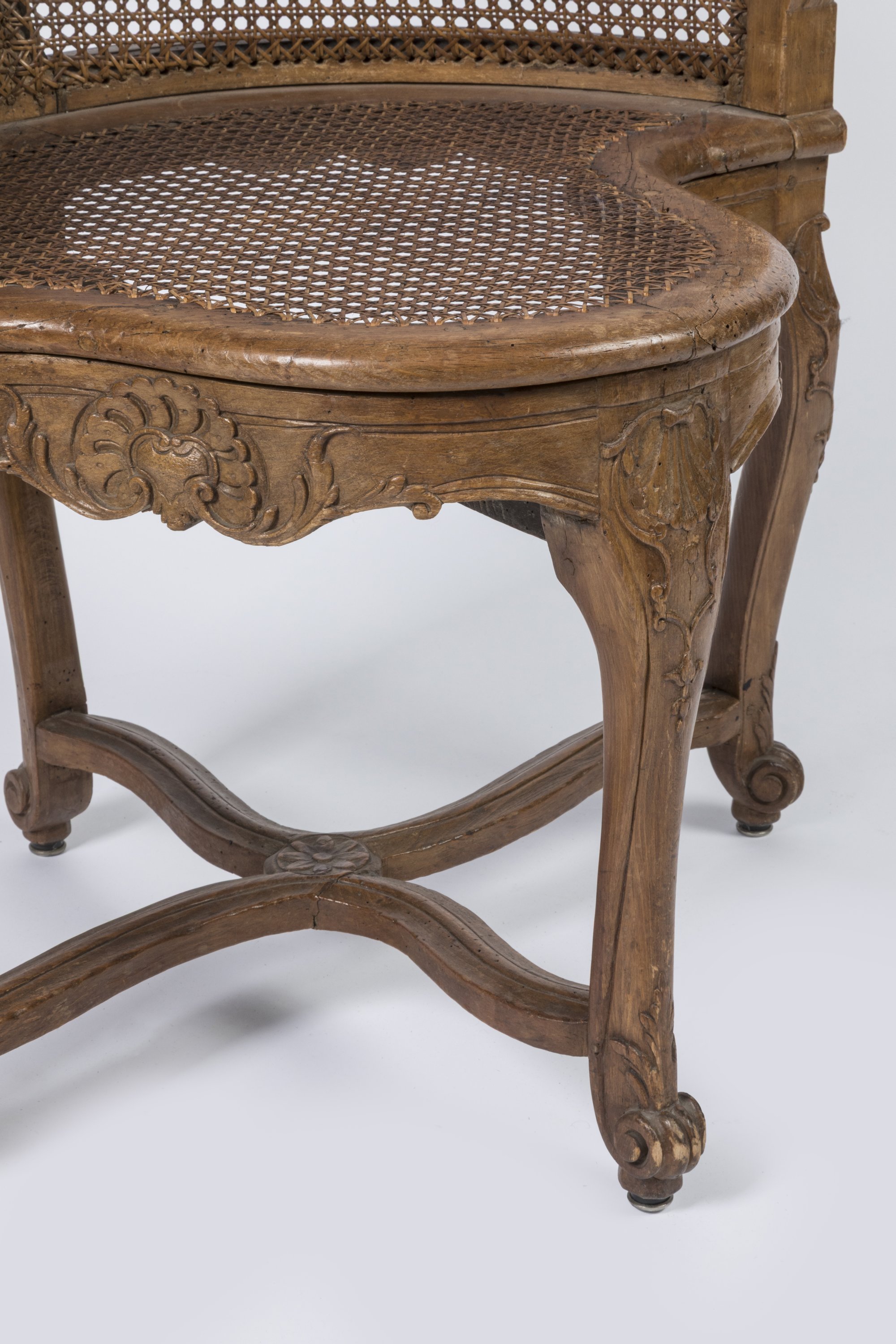 L'amortissement du dossier à décor de fleurettes et d'acanthe, les accotoirs mouvementés terminés en enroulement sont décorés de cartouches et d'acanthe. La ceinture mouvementée est ornée de motifs végétaux et de coquilles. Il repose sur quatre pieds cambrés à décor de cartouches reliés par une entretoise en X décorée d'une fleur en son centre.