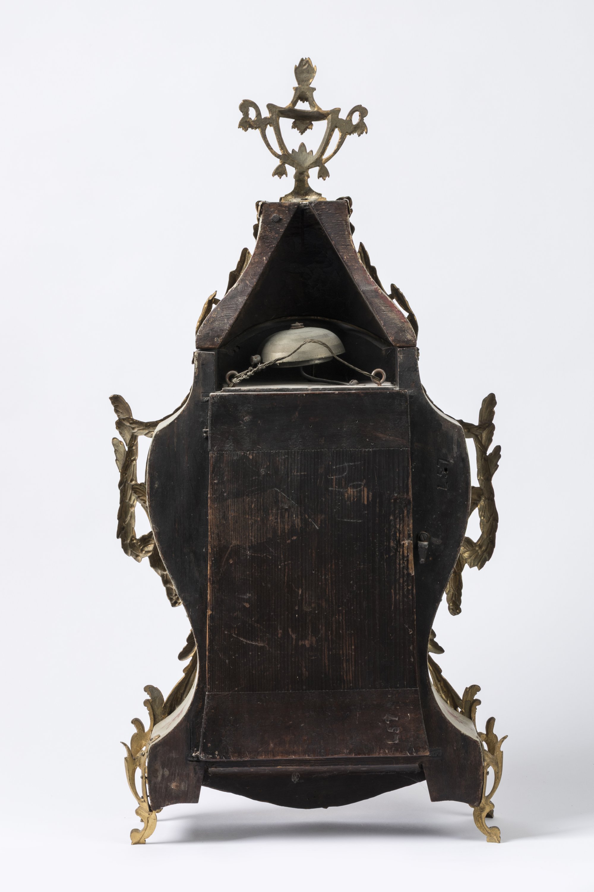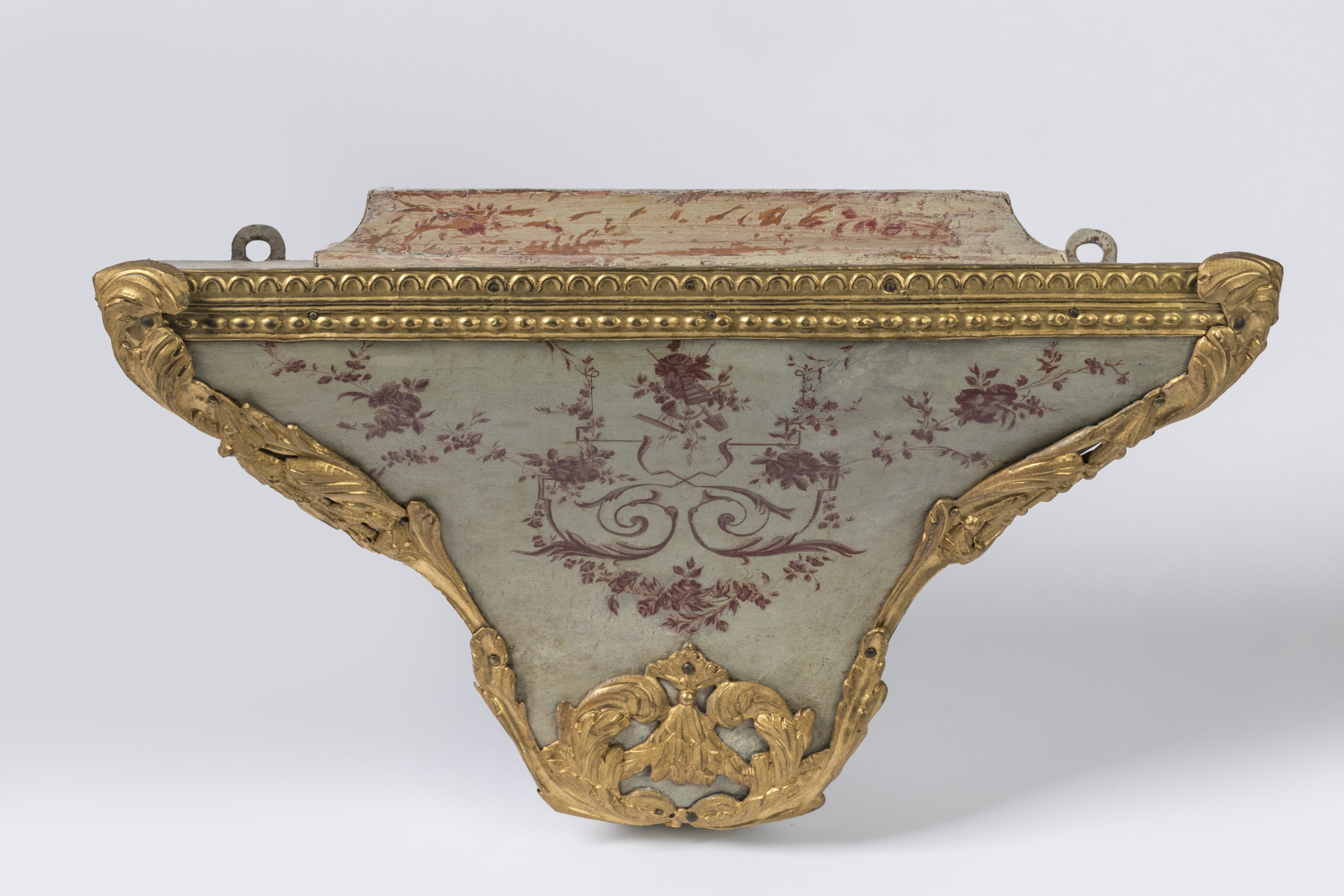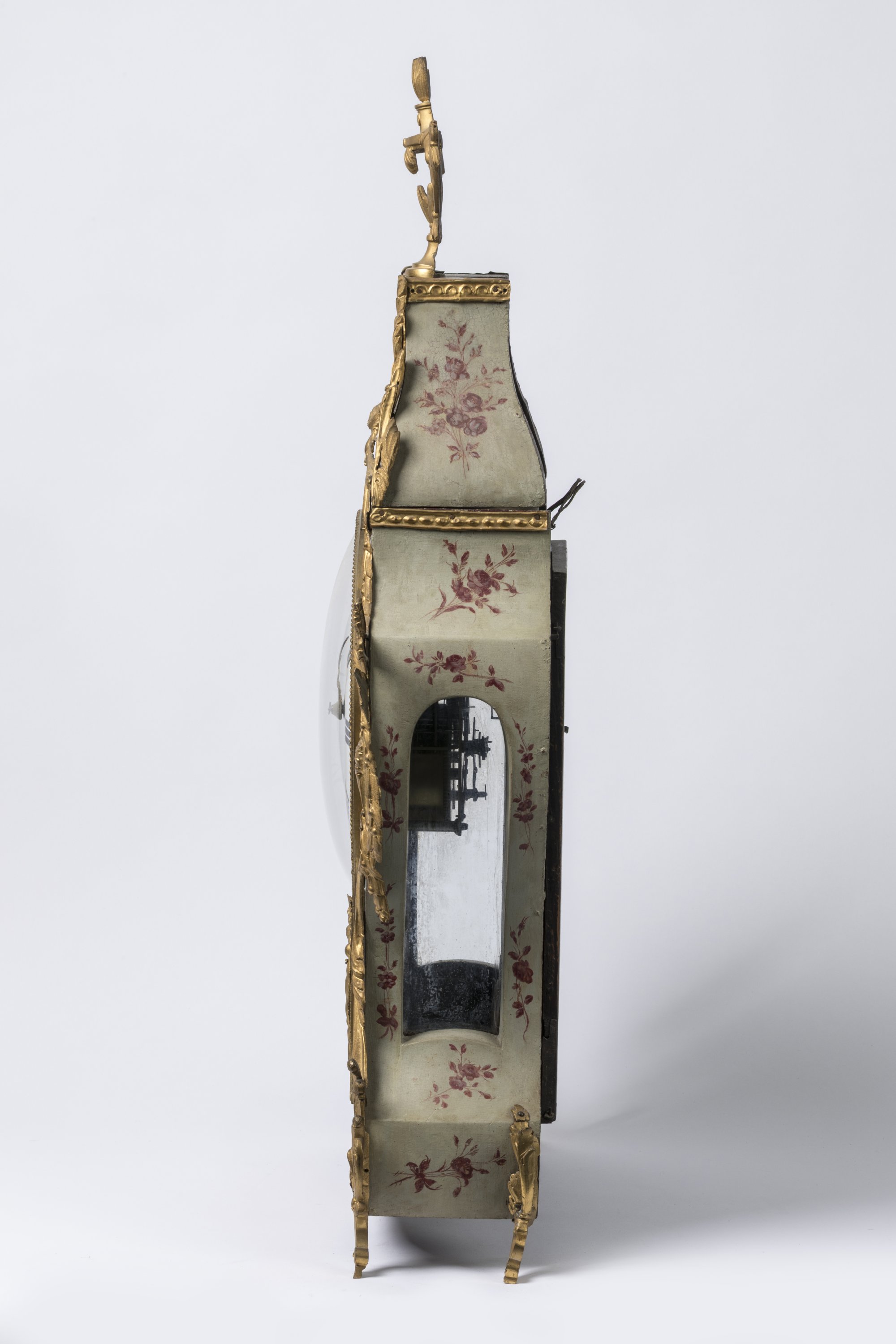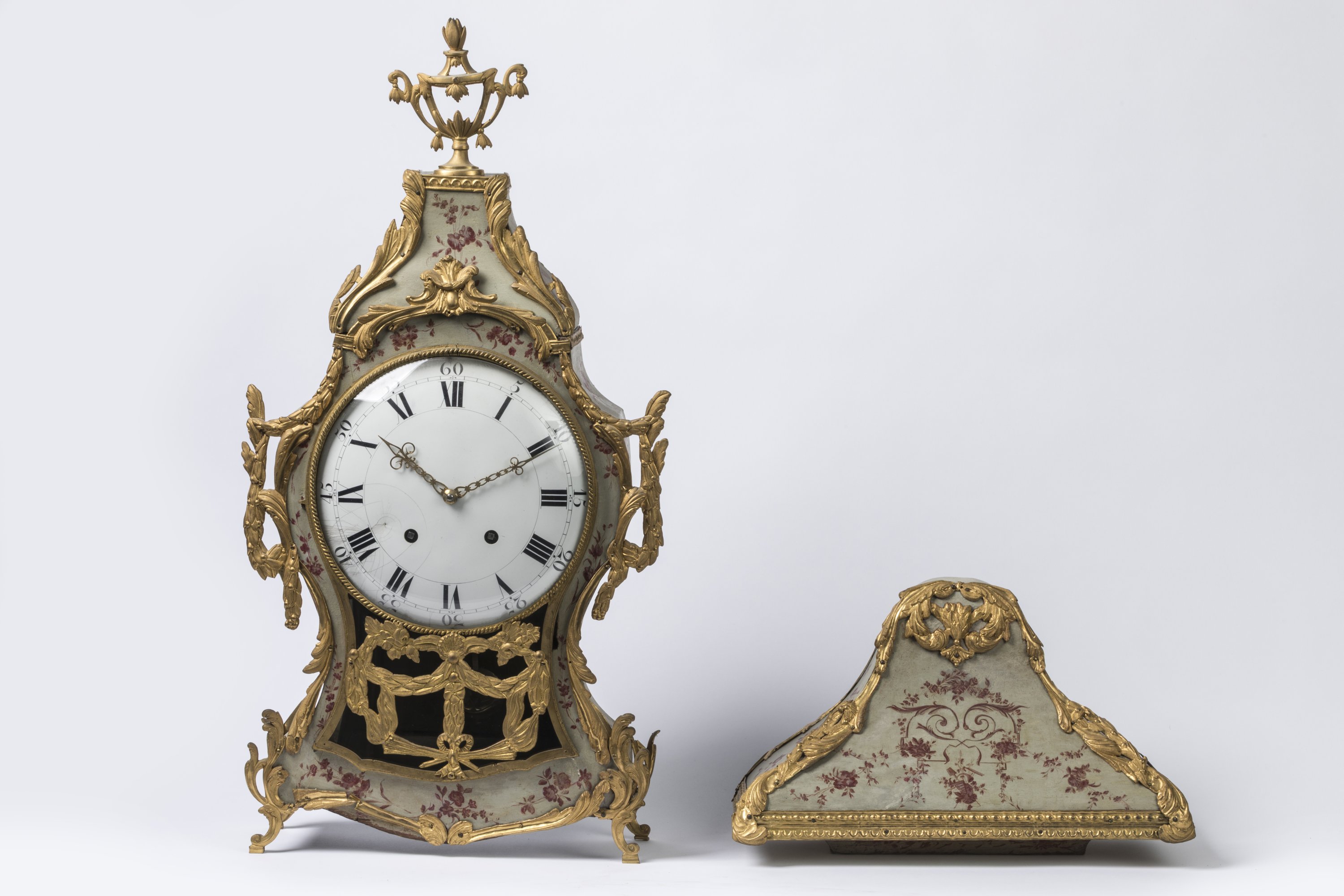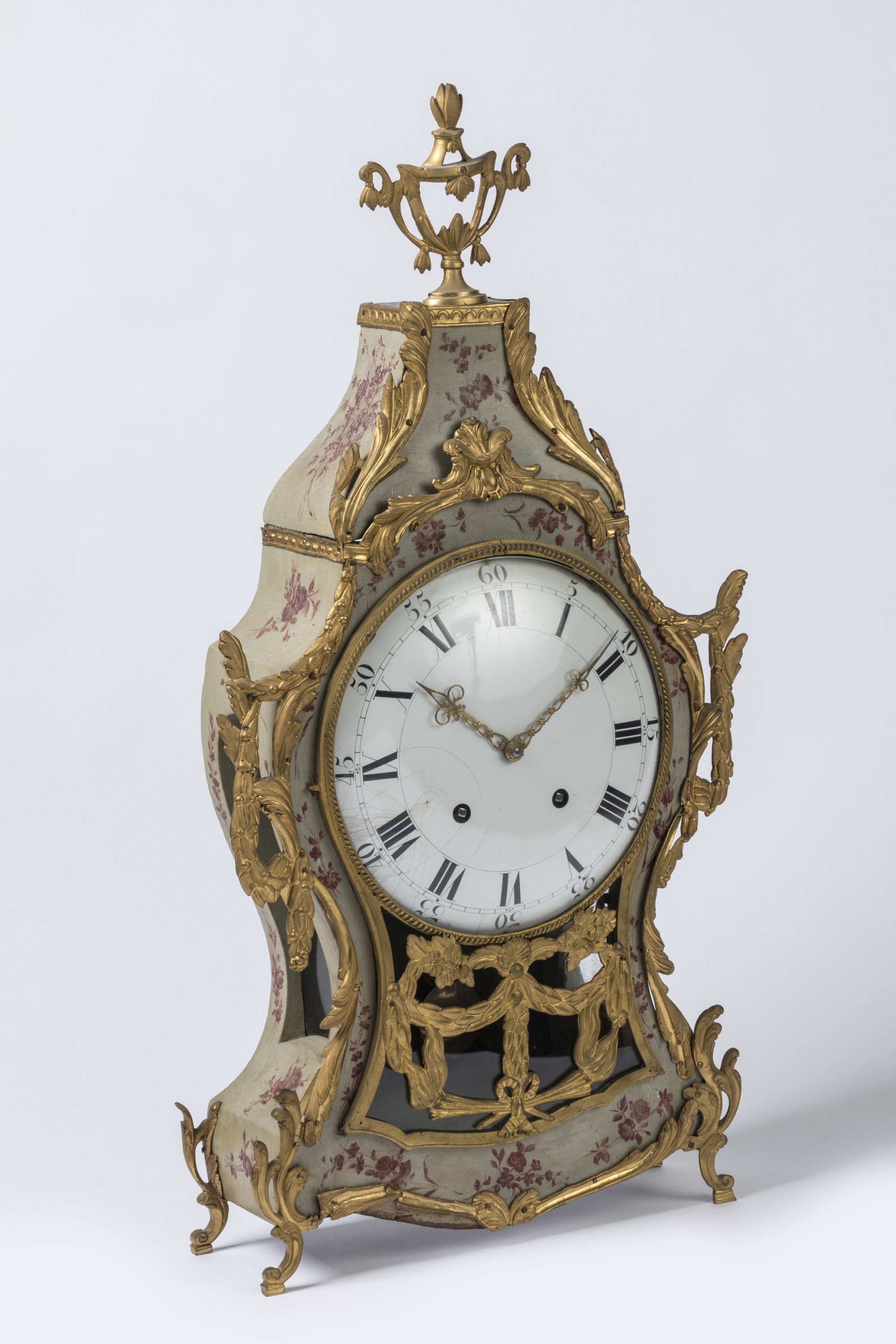 A Louis XV violin-shaped wood wall clock and its cul-de-lampe. Decorated with red flowers on a green background. Partly manufactured in the 18th century.