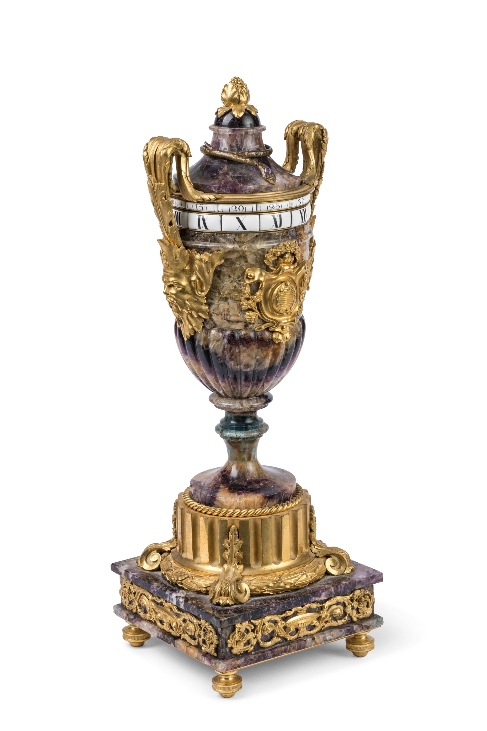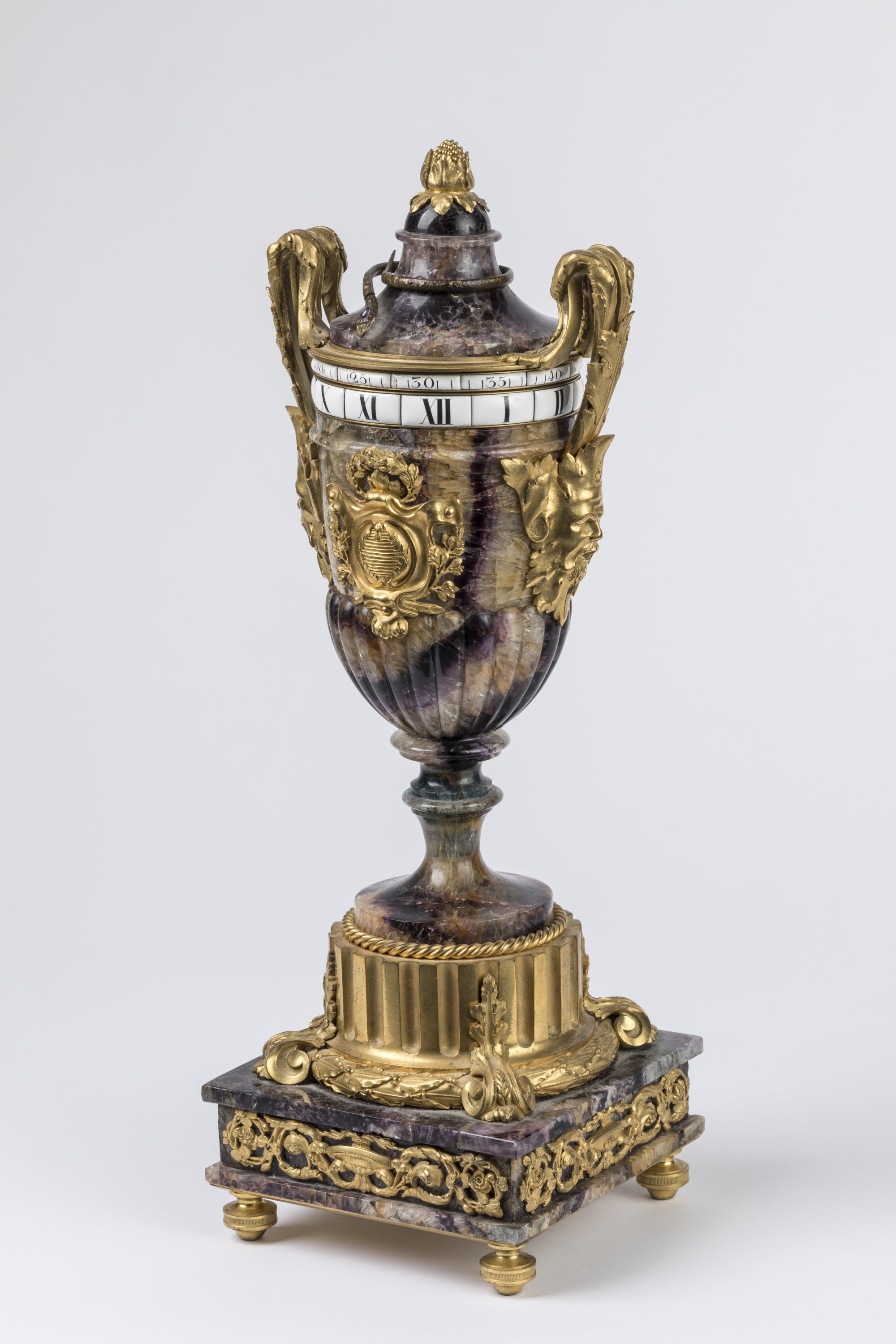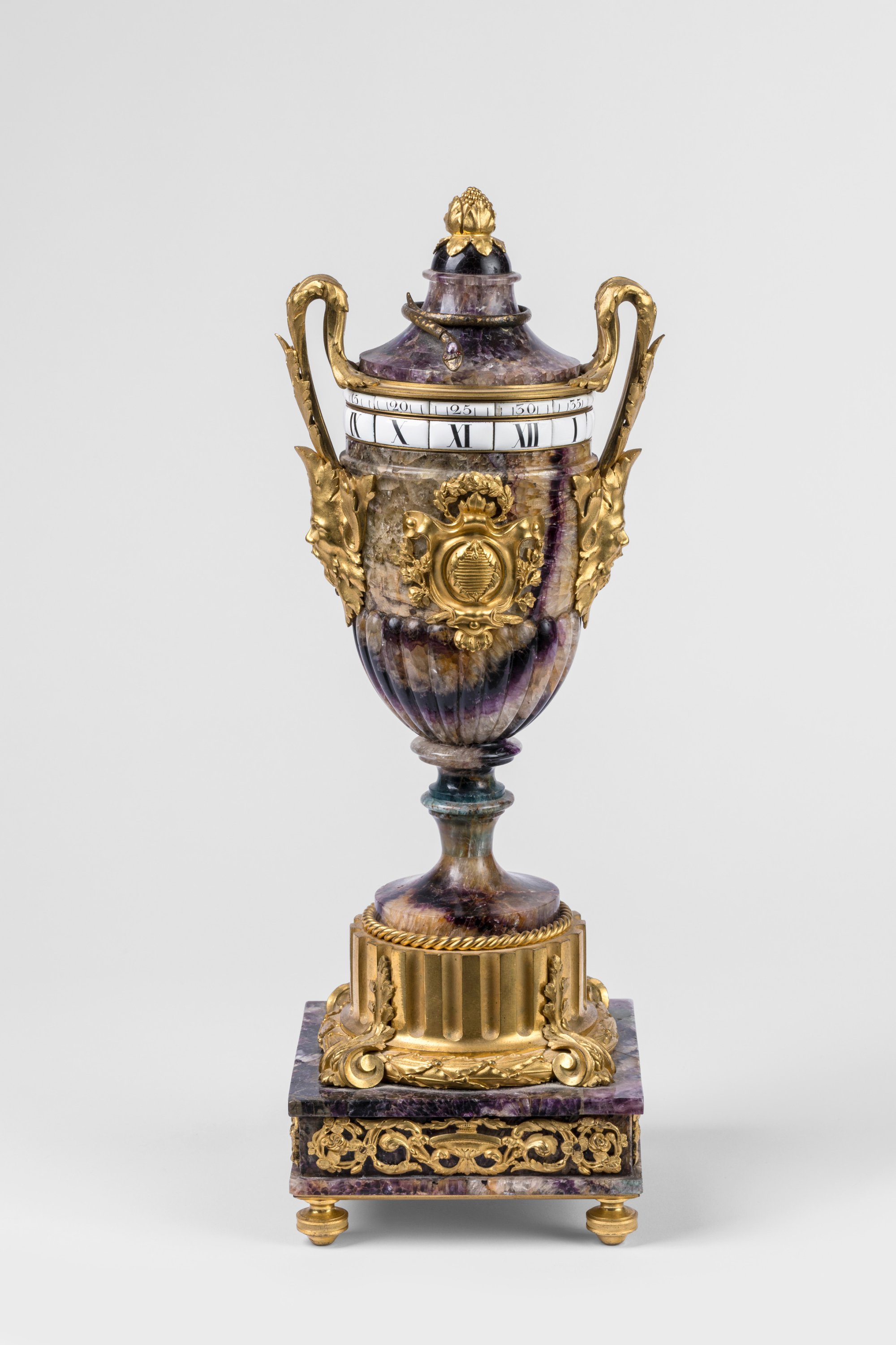 An ormolu-mounted Blue John clock shaped as an antique vase, with rotating dials. Late 18th century.